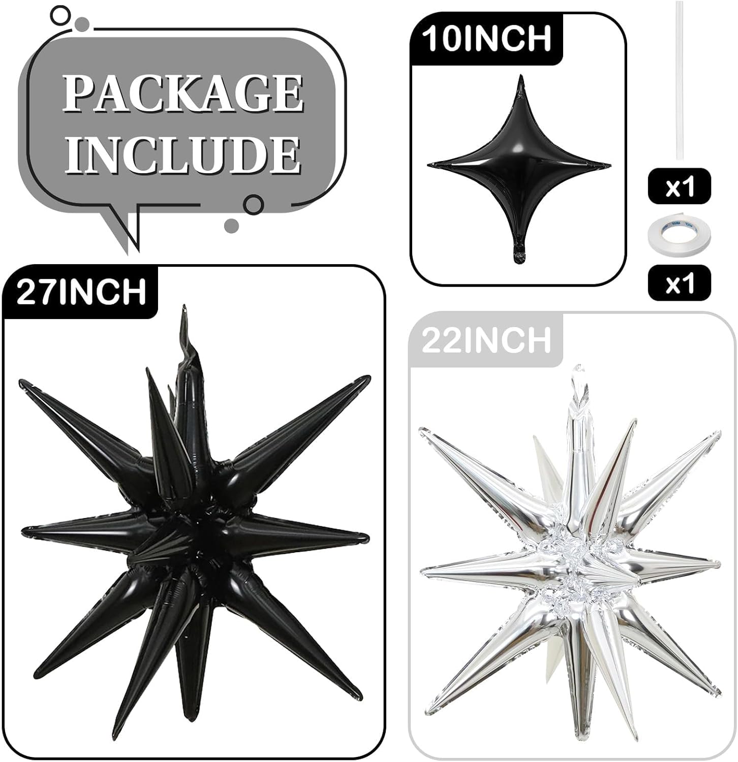Black Silver Star Balloons 12pcs, 27/22 Inch Foil Star Explosion Balloons, Large Spike Mylar Cone Balloon, Fireworks Shape Balloon Decor for Bachelor Retirement Anniversary Graduation