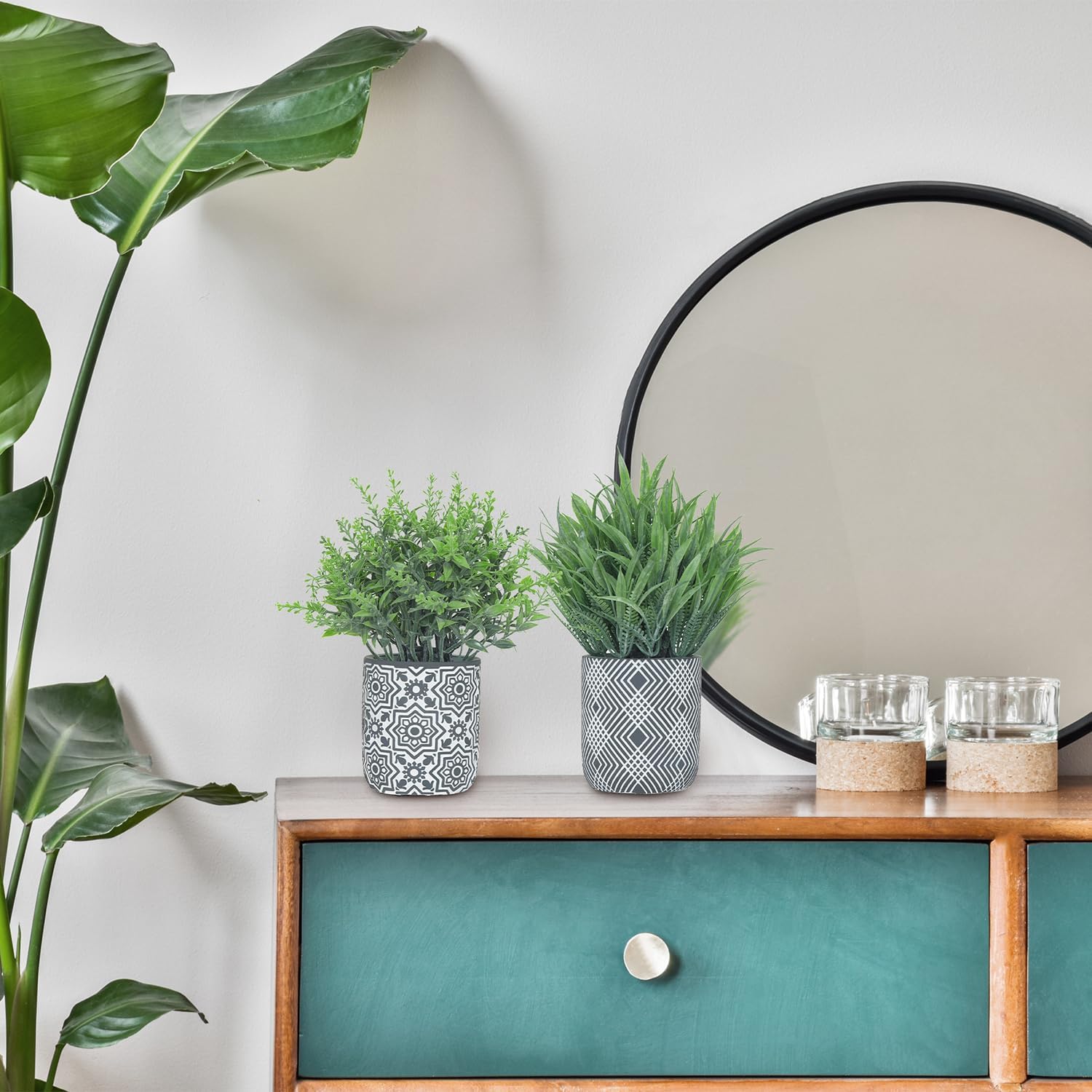 - Durable Material with Fashionable Style: Made of premium plastic, these small fake plants won’t wither or fade. Featuring a sleek geometric pattern and a cement ceramic texture, this planter effortlessly blends modern minimalism with natural charm. Ideal for enhancing Scandinavian, industrial, or boho-style interiors.Please Note: The ceramic pots are fragile — handle with care