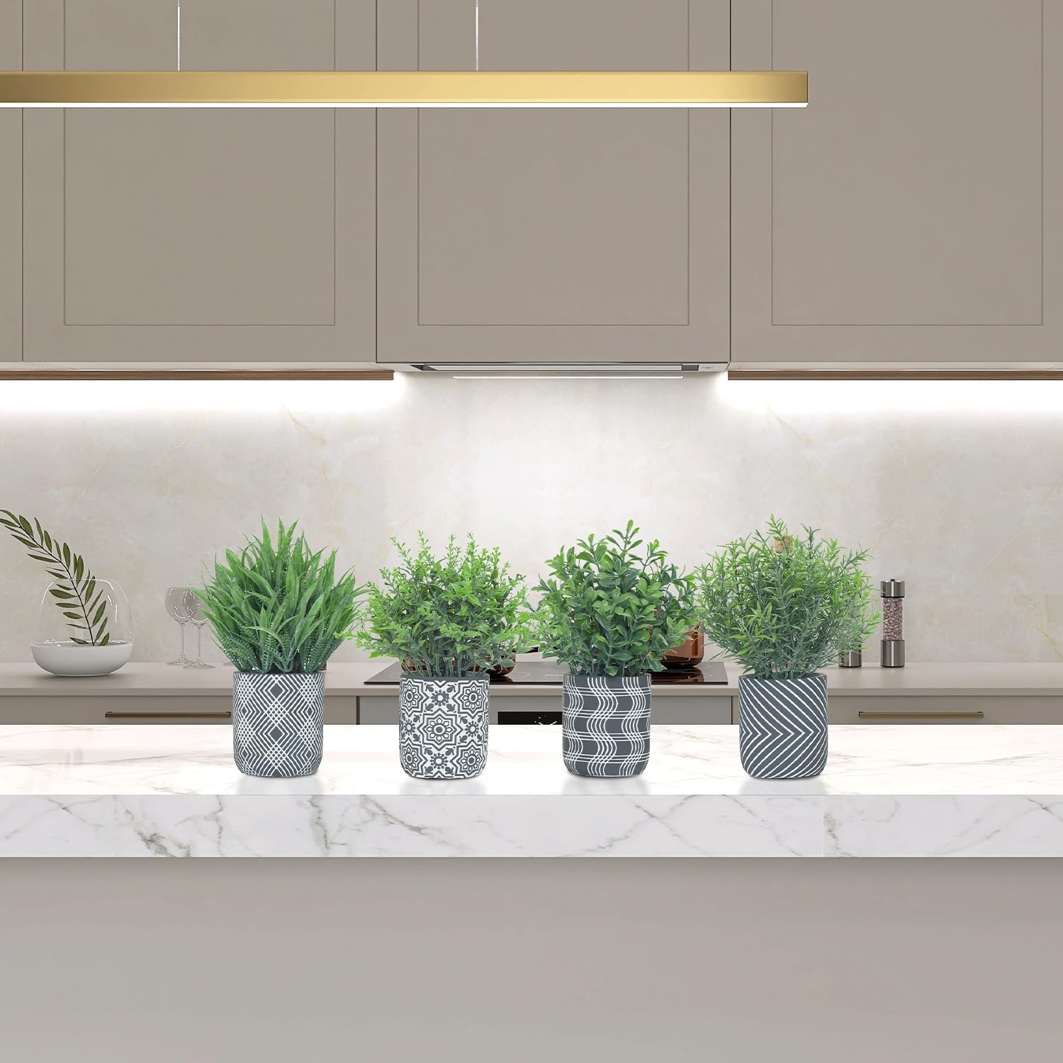 - Small Size & Adjustable Shape: Includes 4 artificial plants (grass, rosemary, boxwood, lavender), each approx. 9"H & 5.5"W. Patterned cement pots (3.1"W x 3.5"H). Gently adjust leaves for desired shape. You can gently adjust the leaves to achieve your desired shape and fullness. NOTE: The leaves may be slightly compressed during shipping — simply reshape them by hand to restore their natural appearance
