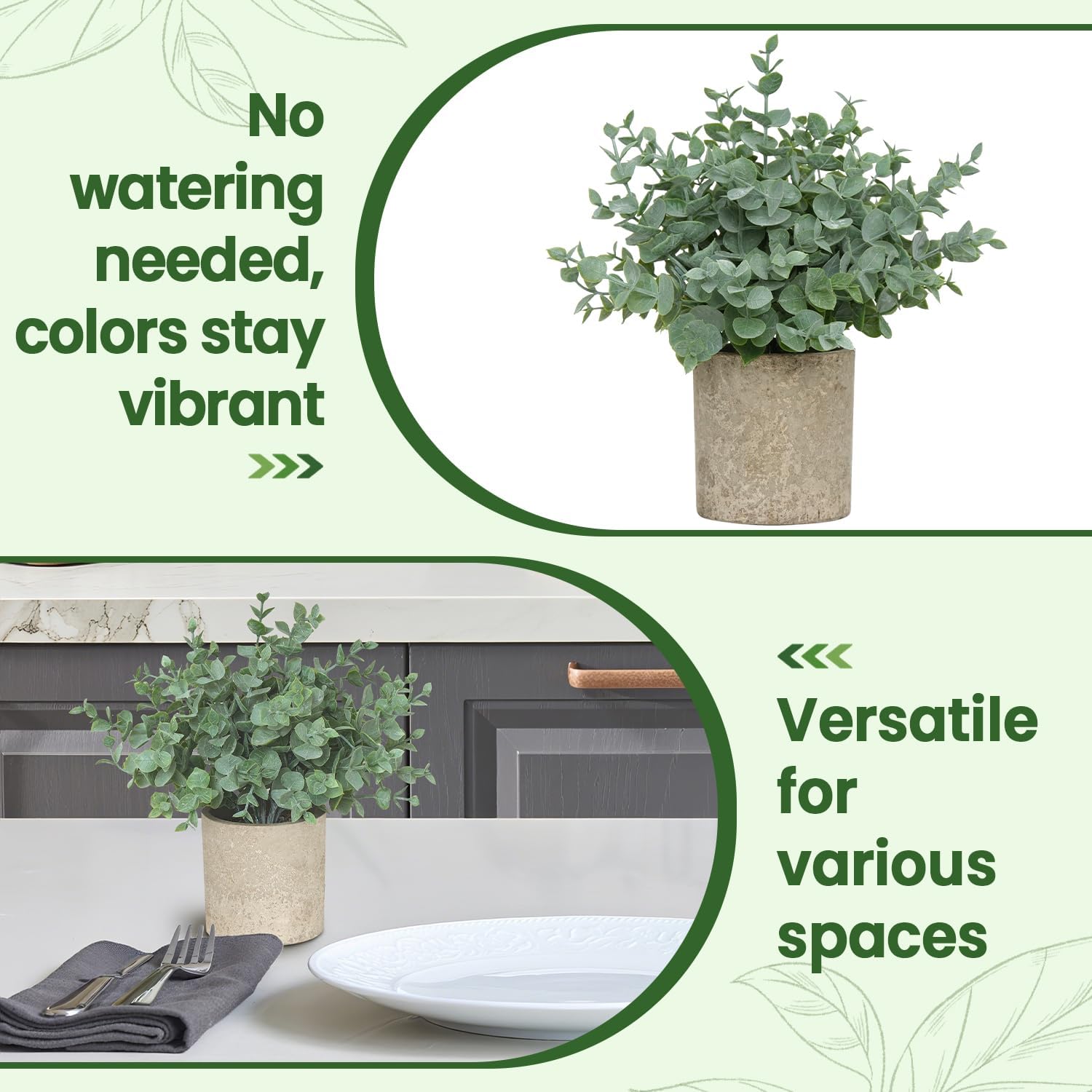 - Realistic Small Fake Plants: These small fake plants feature frosted eucalyptus leaves with clear textures, mimicking the natural appearance of real greenery. Carefully crafted with a soft sage green tone, some leaves show a delicate frosty-gray finish [which is not dust], enhancing their realistic and fresh look
