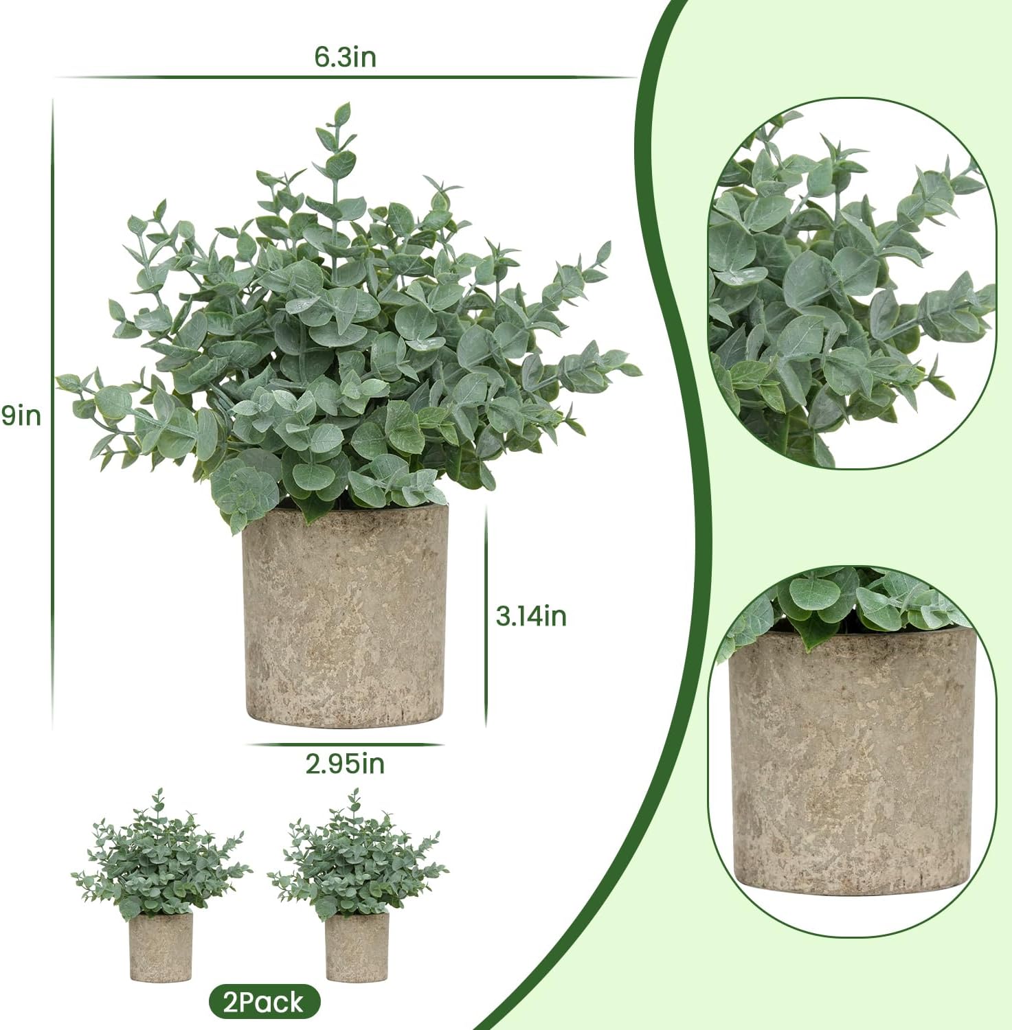 - Small Size & Adjustable Shape: This set includes 2 small artificial eucalyptus plants, each measuring approximately 9 inches in total height (from the top of the plant to the bottom of the pot) and 6.3 inches in width when the leaves are fully spread. The gray paper pulp pots are about 2.95 inches wide and 3.1 inches tall. You can gently adjust the leaves to achieve your desired shape and fullness. NOTE: The leaves may be slightly compressed during shipping — simply reshape them by hand to restore their natural appearance