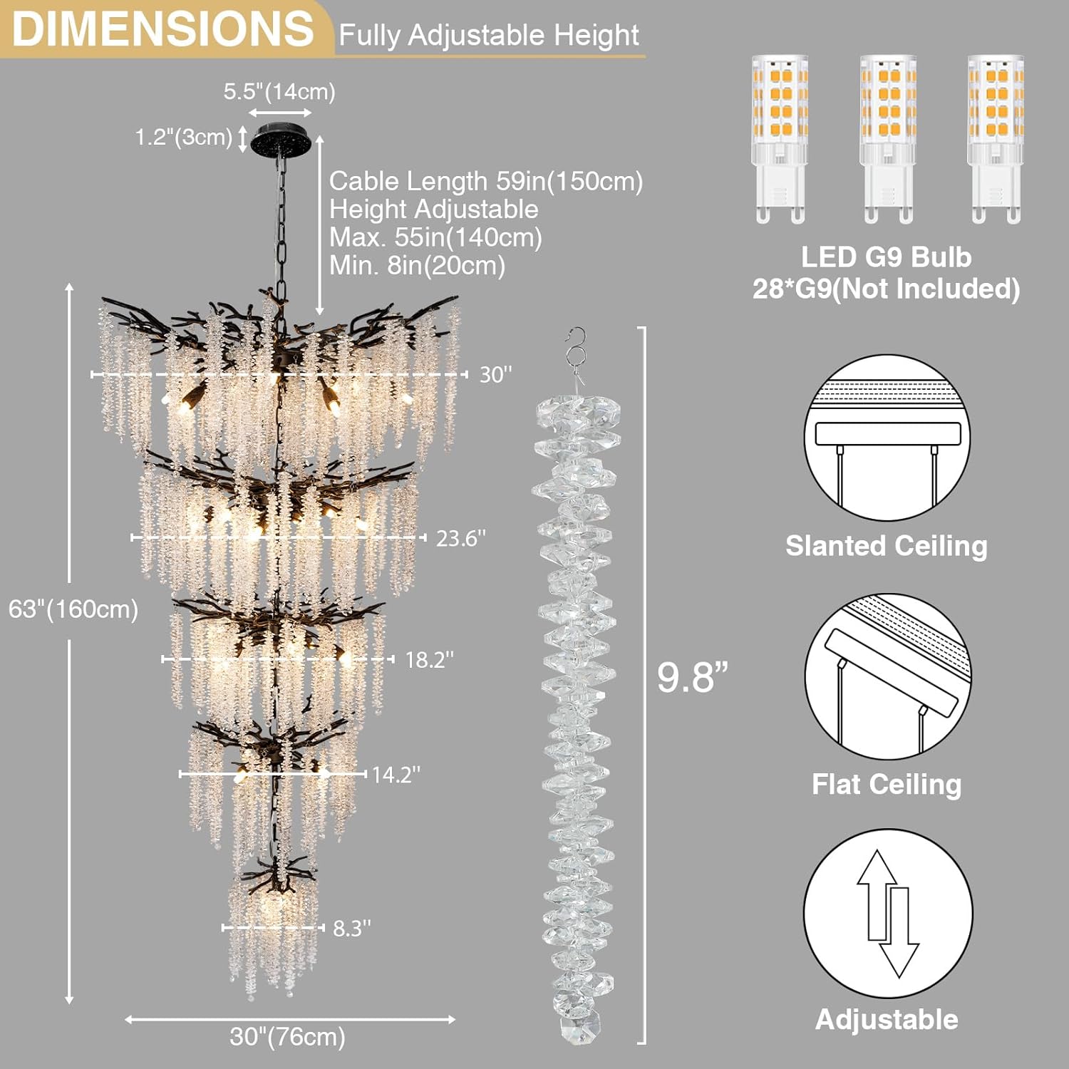 - Chandelier Size Installation Parameters: Diameter 30in (2.5ft), Height: 63in (5.25ft), the chandelier cable length is 59in (5ft), adjust the cable length to extend the chandelier to 118in (9.85ft). The branches are made of aluminum alloy, you just need to hang the crystals on the branches and then gently adjust each branch to achieve the effect.