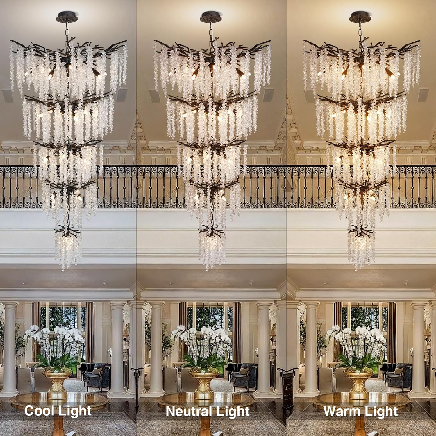 - Luxury Crystal Chandelier: This stunning high ceiling chandelier draws its design inspiration from tree branches, symbolizing the flourishing and happiness of a family. 5-layer chandelier is crafted with exquisite black decorative branches and 100% top-quality K9 crystals, creating a star-like radiance. It represents abundance in love, career, family, and friendship, showcasing a natural artistic beauty. It‘s the best choice to enhance the artistic sense of interior space.