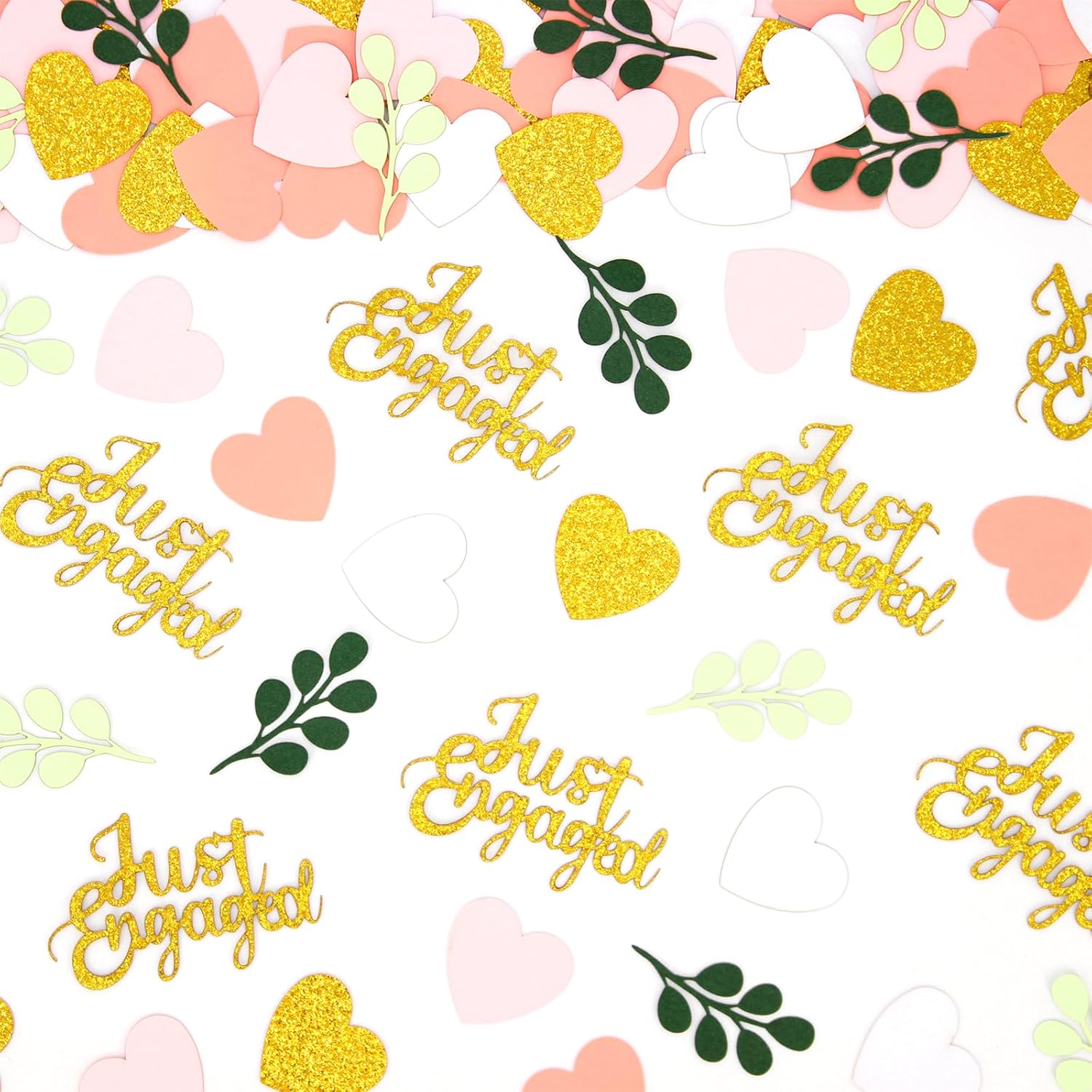 - 1.Elegant Color and Design-Great engagement party decor.The engagement confetti for tables match the sage green and pink gold white heart and greenery eucalyptus leaf with special gold glitter “just engaged” letters, which will show the unique visual impact and make the whole party warm and energetic.