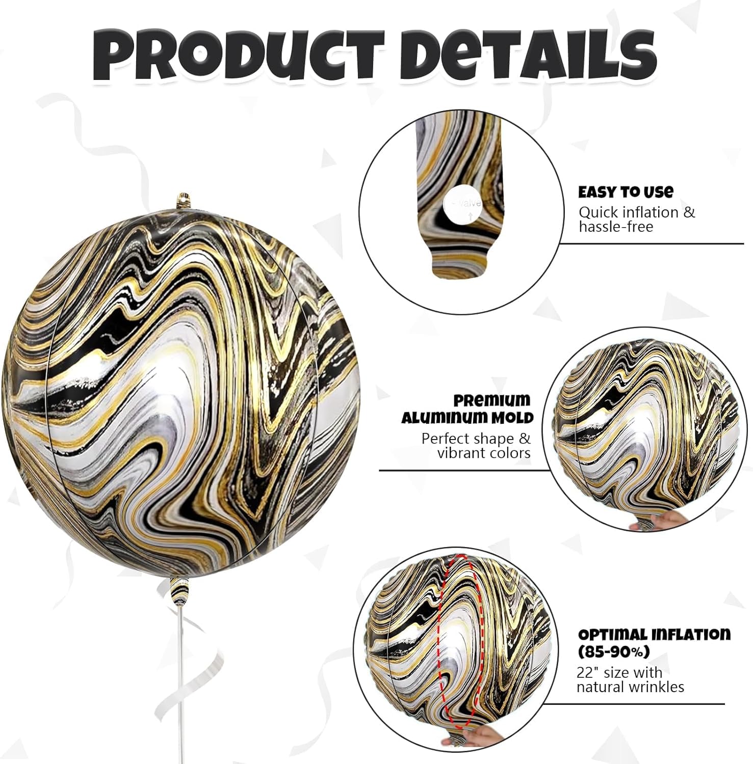 - Premium Quality – Made from high-grade metallic foil, these marble balloons are sturdy, reusable, and hold helium or air for long-lasting party decorations.
