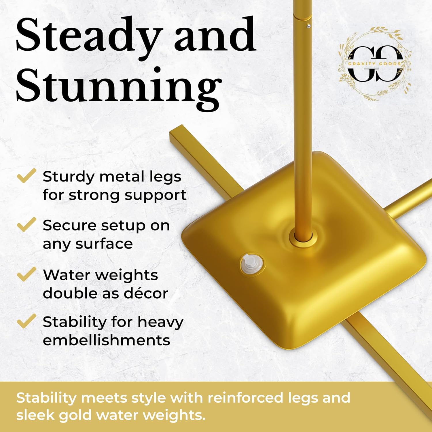 - STAY FOCUSED ON CELEBRATIONS & not on a wobbly backdrop stand for parties. The 2 gold water weights hold it steady during outdoor gusts or indoor setups. With a gold finish, there's no need to search for weights that match your elegant design