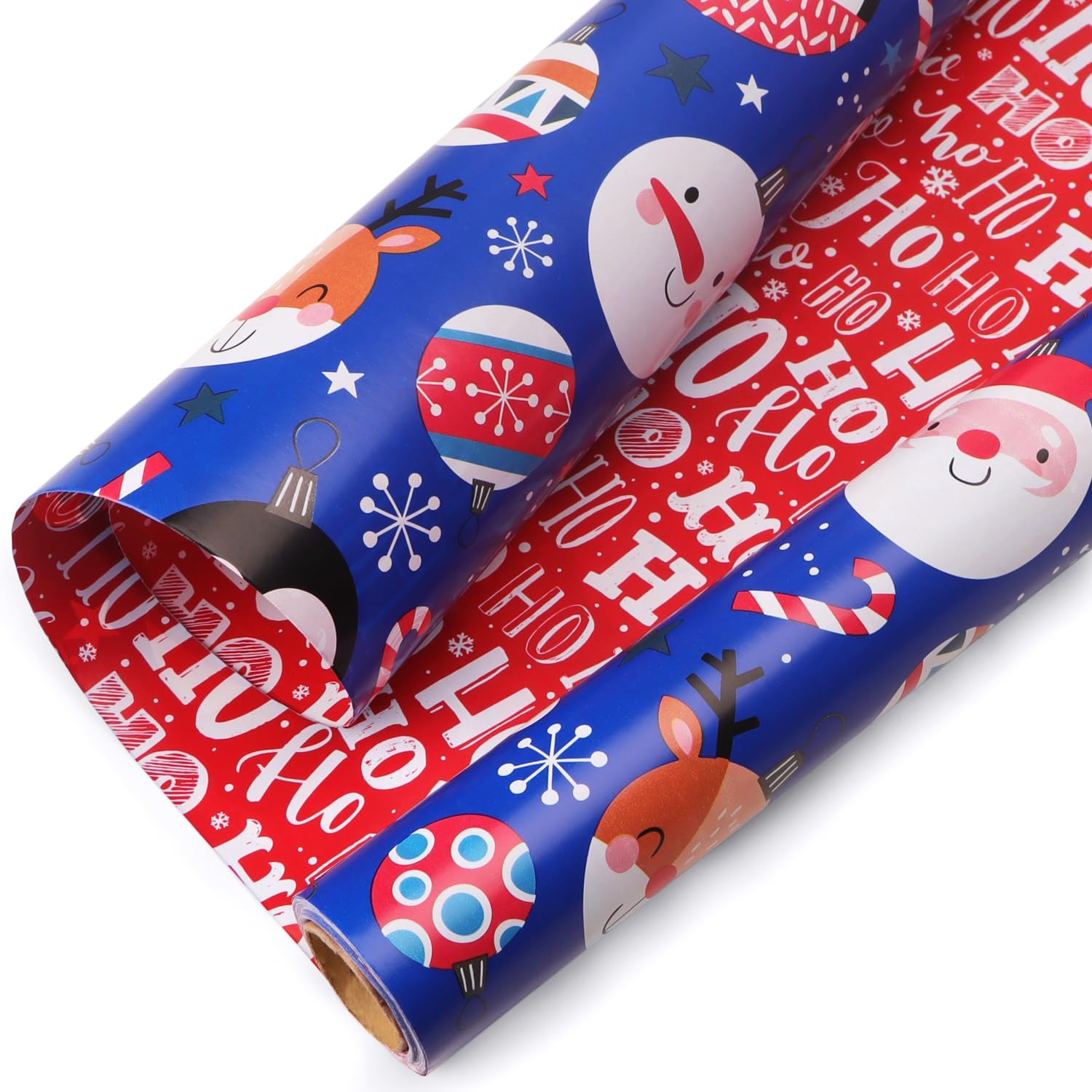 Ribbli Blue Christmas Wrapping Paper Reversible Cute Christmas elements Gift Wrapping Paper Rolls for Kids Holiday Presents Decoration-17 Inch x 33 Feet