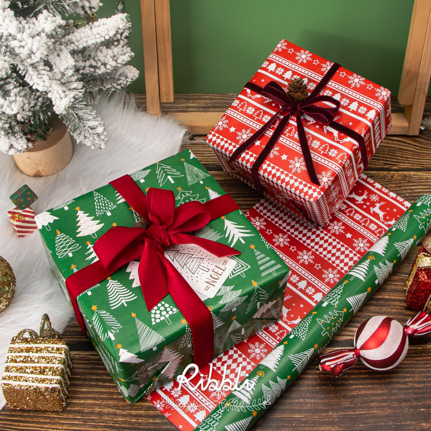 Ribbli Christmas Wrapping Paper Reversible Green Christmas Tree and Red Reindeer Gift Wrapping Paper Rolls Holiday Presents Decoration-17 Inch x 33 Feet