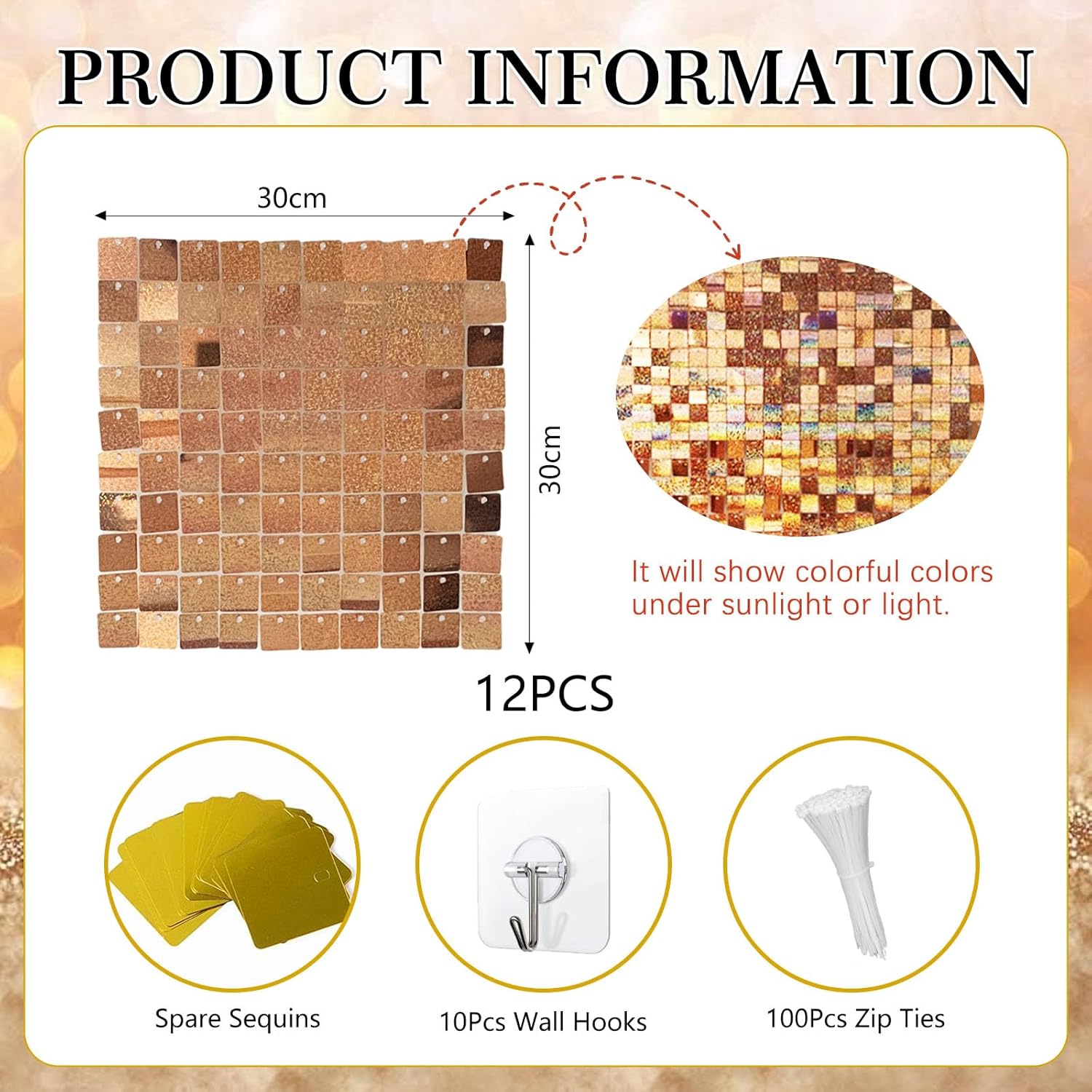 - 【Package Includes】Each box includes 12 champagne laser sequin wall panels (12"x 12" each). We provide enough zip ties (100 pcs), a pack of spare sequins, and wall hooks (10 pcs) to support the weight of the wind panel, as well as an installation manual. 12pcs can cover 3x4ft place. More boxs will cover a larger area and have a fuller look.
