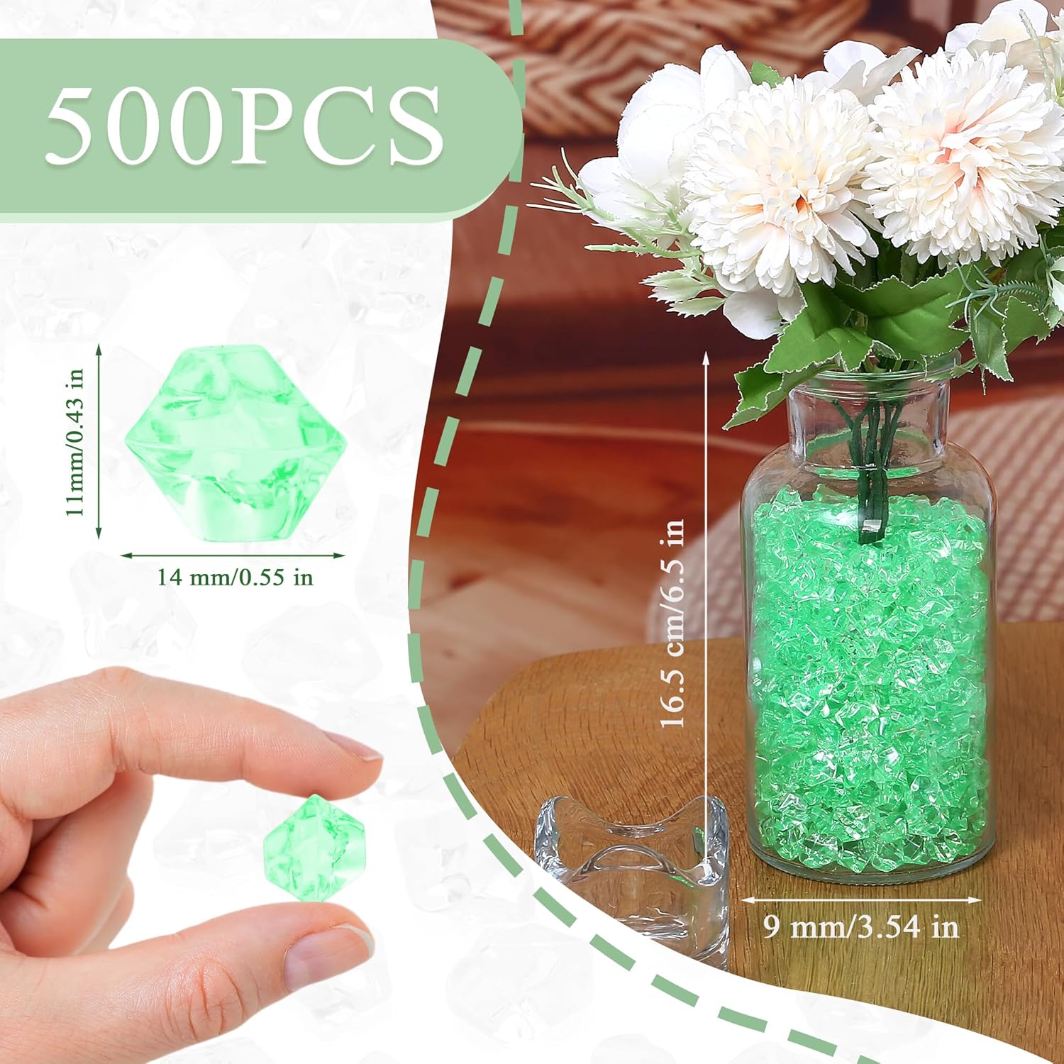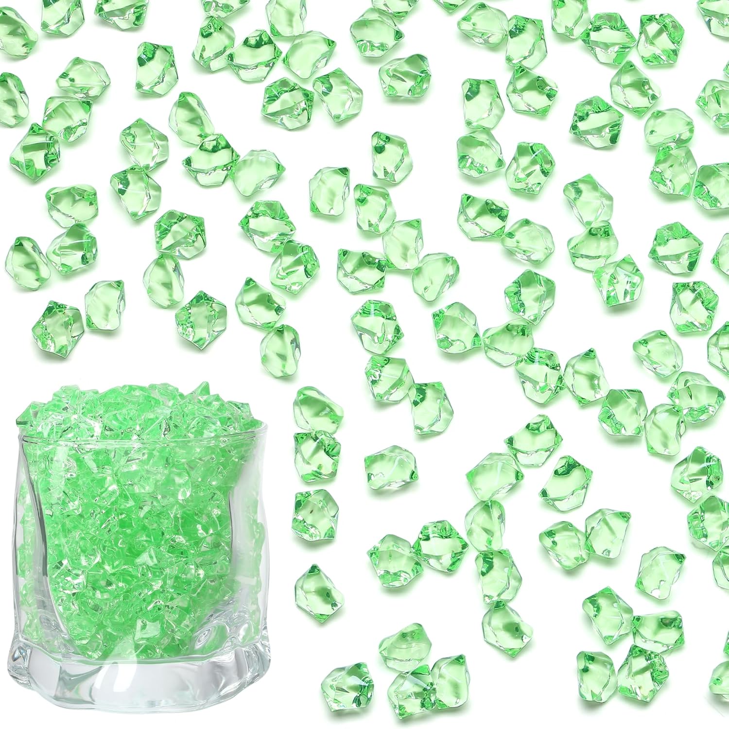 - Green Acrylic Ice Cubes – Each box includes 500PCS green fake ice cubes, approx 11–14mm in irregular shapes. These vibrant green vase fillers are widely used for wedding centerpieces, table scatter, spring parties, and festive décor, bringing freshness and vitality to both modern and rustic event styling