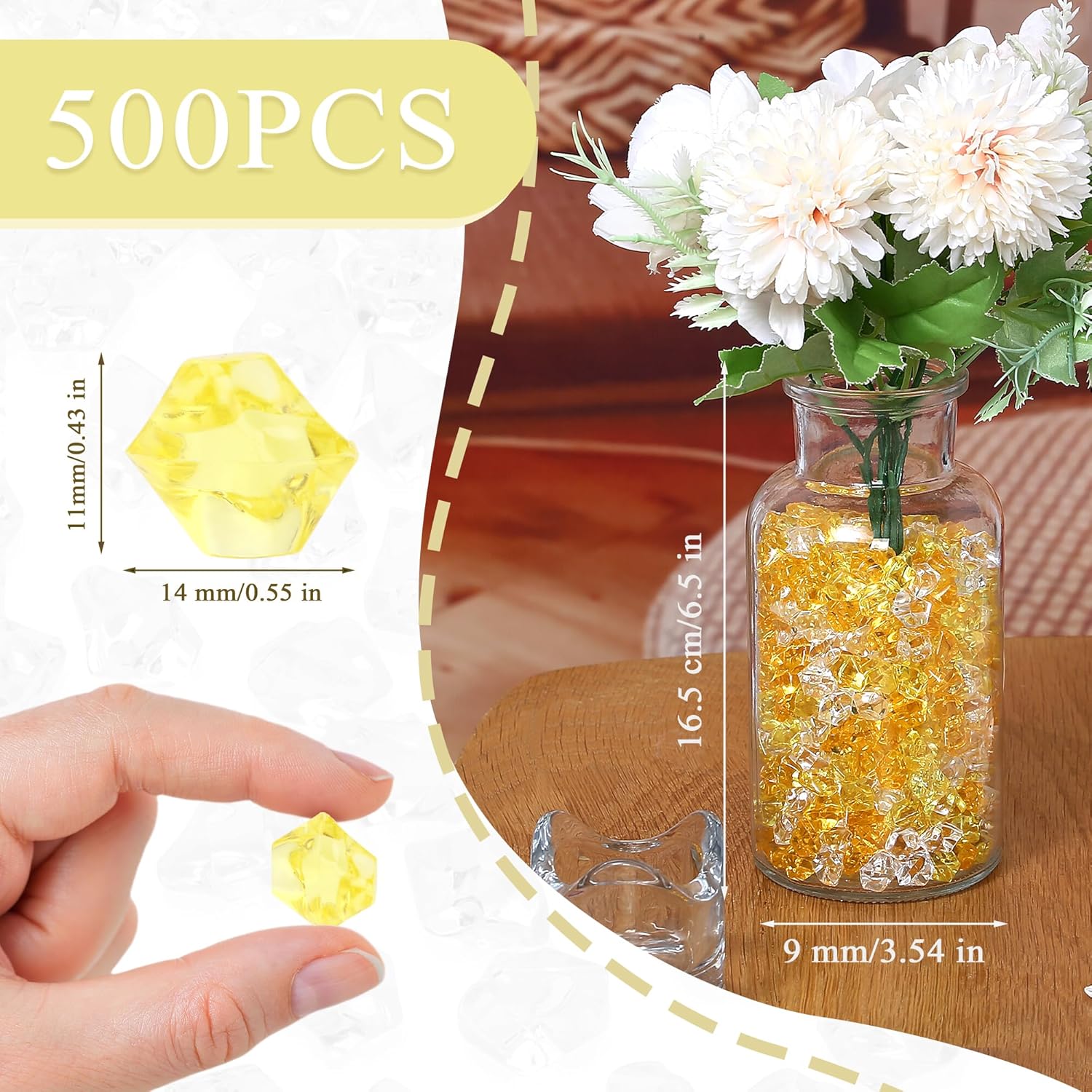 - Yellow Acrylic Ice Cubes – Each box includes 500PCS yellow fake ice cubes, each approx 11–14mm with irregular shapes. These yellow vase fillers are widely used for centerpieces, wedding decorations, table scatter, and party décor, bringing brightness and cheer to modern and festive events