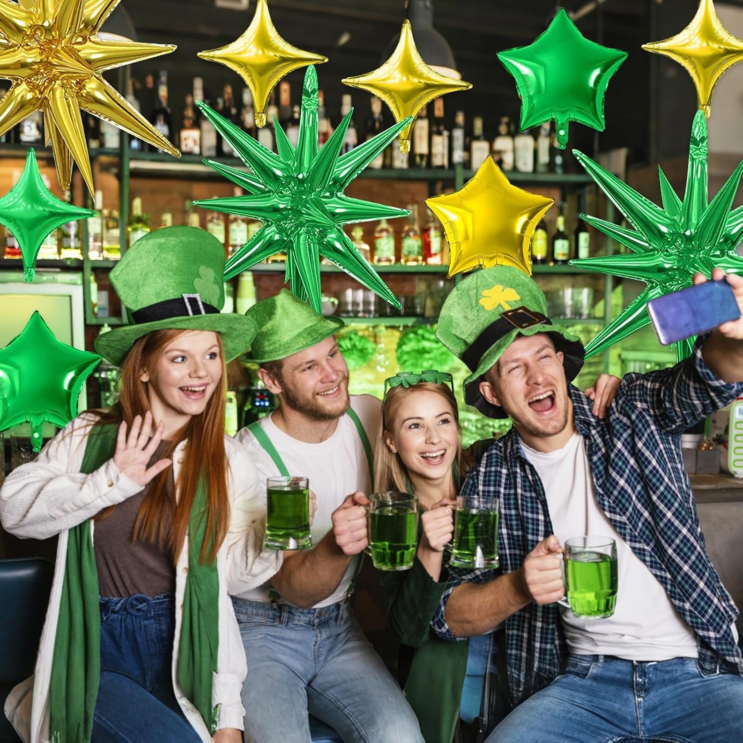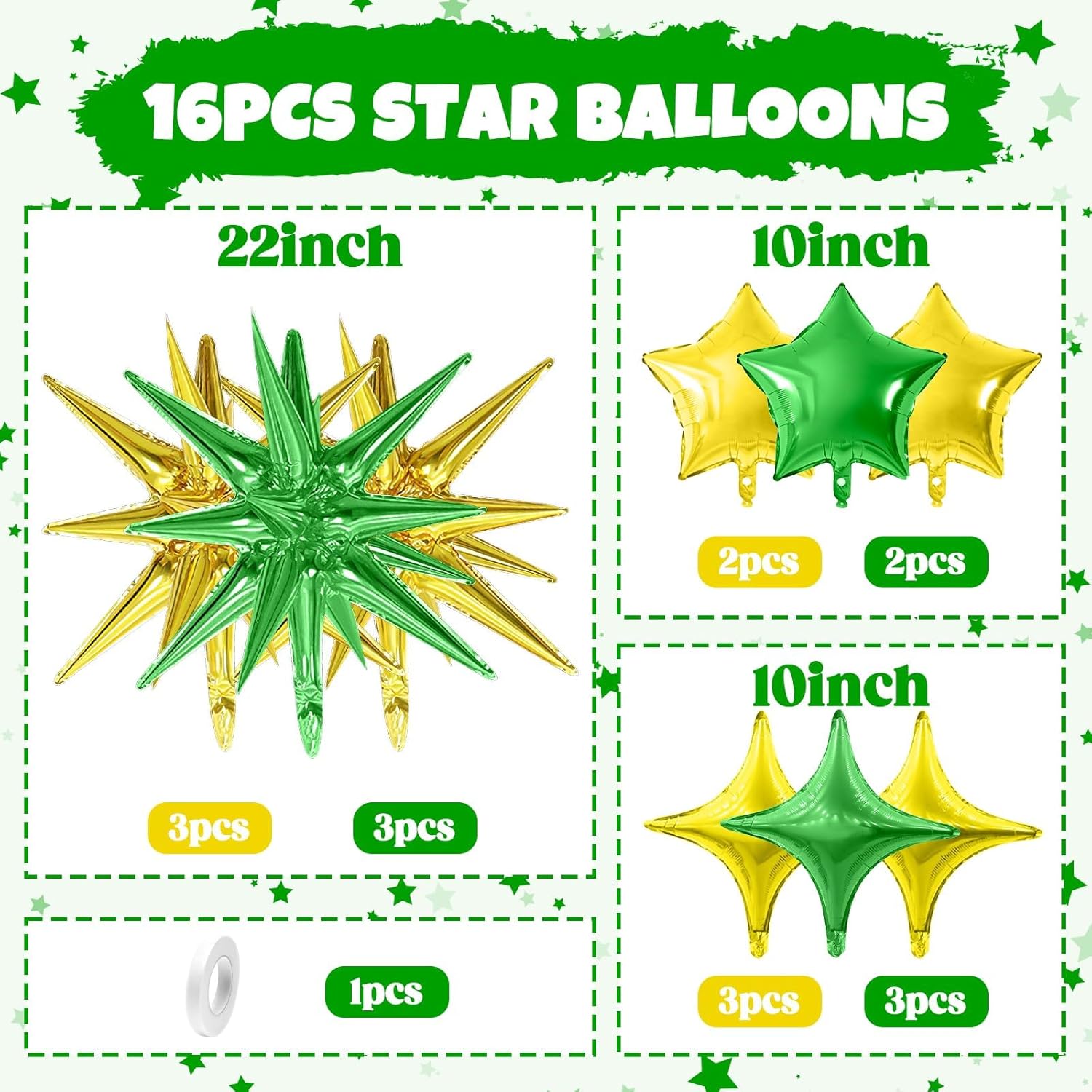 - Package: This set includes 6pcs 22inch explosion star foil balloons(gold*3, green*3), 4pcs 10inch star foil balloons(gold*2, green*2), 6pcs 10inch four angle star balloons(gold*3, green*3), and a ribbon. Perfect for creating a dazzling party atmosphere.