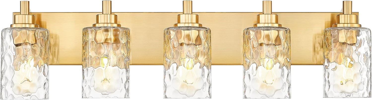 - Inspired Design: The 5-light bathroom vanity light feature a combination of clear hammered glass cylinder shades and a brushed gold metal long base back plate, creating a fusion of timeless elegance and modern minimalism. The bathroom lighting fixtures over mirror are sure to add a touch of unique charm and ambiance to your space
