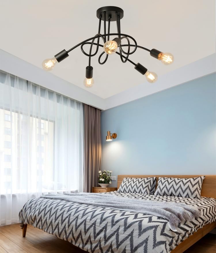 Modern Farmhouse Chandelier,25 Inch Black Metal Spiral Rustic Vintage Semi Flush Mounted Ceiling Light Fixture for Dining Room Bedroom Kitchen Island Hallway Foyer Entryway(5-Light)