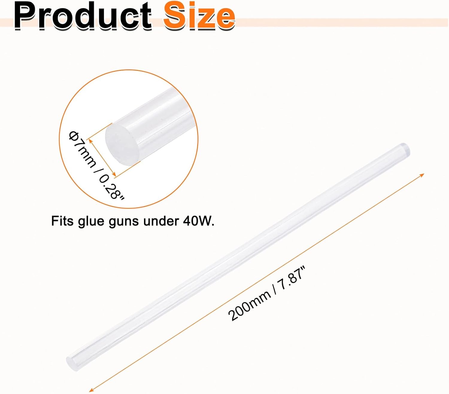 - Size - Hot glue sticks size: 7 x 200mm / 0.28 x 7.87 inch (D*L); Curing time: 10–15 seconds; Working temperature: 150°C (302°F); Softening point: 75°C (167°F).