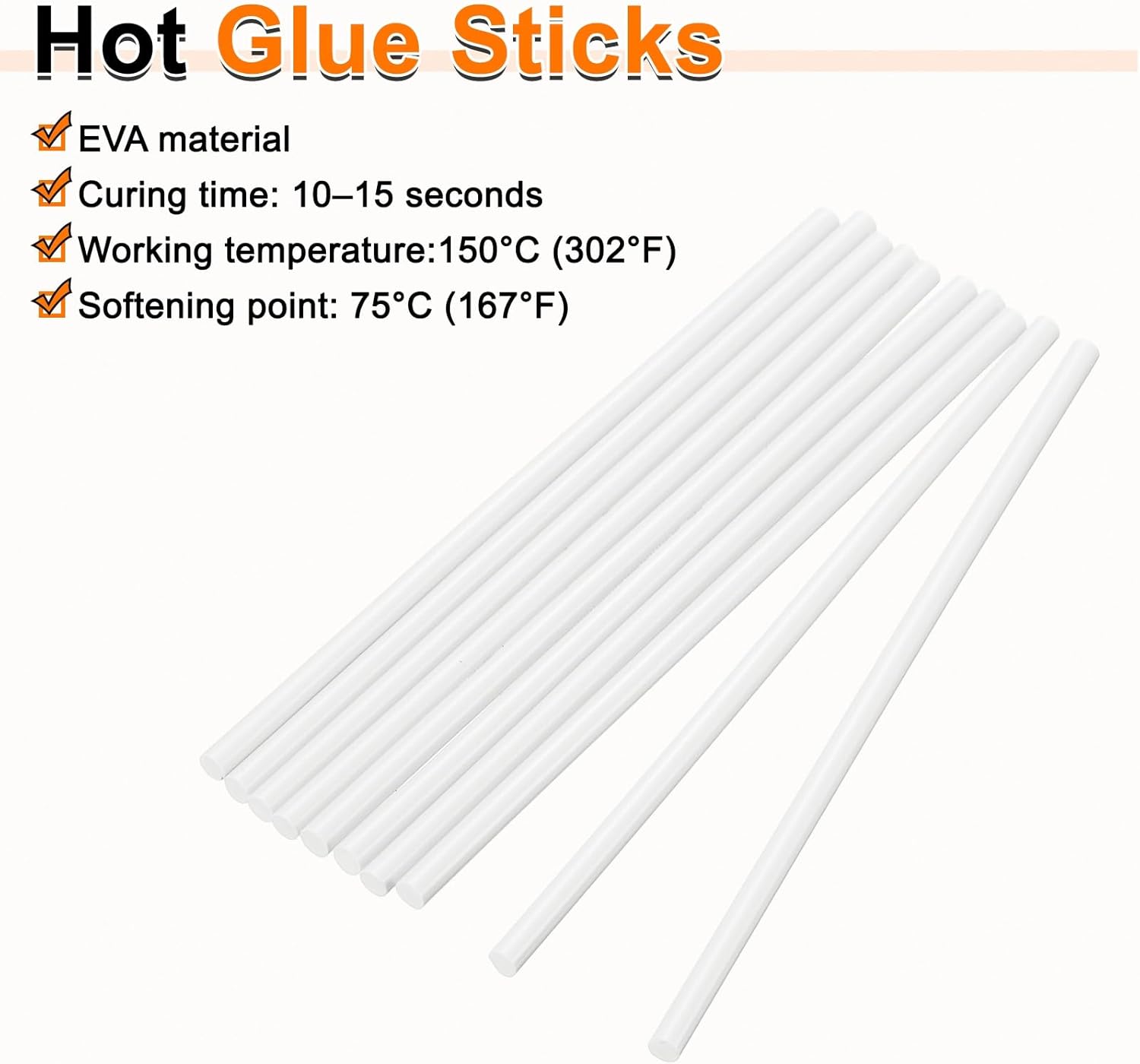 - Size - Hot glue sticks size: 7 x 200mm / 0.28 x 7.87 inch (D*L); Curing time: 10–15 seconds; Working temperature: 150°C (302°F); Softening point: 75°C (167°F).