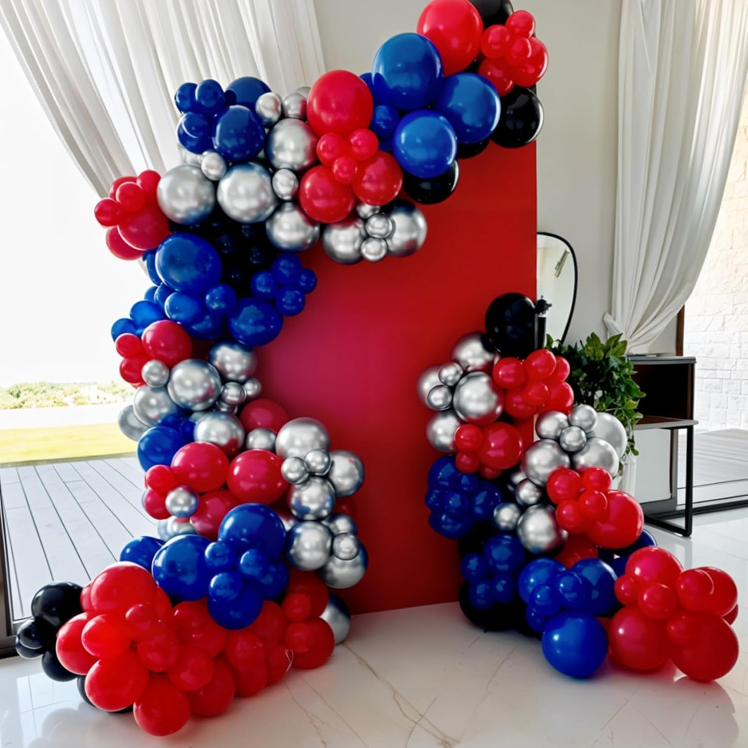 - 【Easy to Assemble】Easily fill the red blue black balloons with air or helium. Use the included silver ribbon to tie or suspend them on walls, arches, doors, or ceilings. Great for DIY enthusiasts—design balloon columns, centerpieces, or themed photo backgrounds. Whether you're decorating solo or as a team, setup is smooth and quick with impressive results.