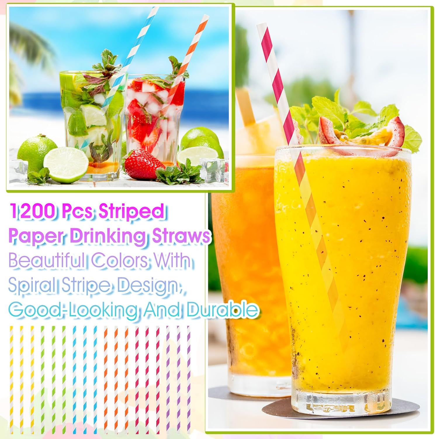 [1200 Pack] Striped Paper Drinking Straws,Sturdy & Non-Soggy,Food-Safe Ink, and Multi-Layered for Long-Lasting Use,Vibrant Assorted Colors for Summer Juice, Shakes, Cocktail,7.87 Inches