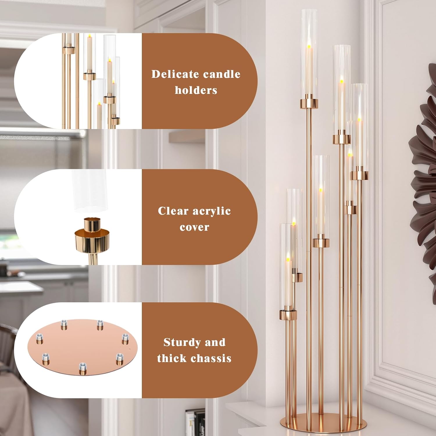 - UNIQUE DESIGN: Our 4pcs floor candle holders for wedding is 7 arms, the whole is arranged from high to low, staggered, very unique, the appearance is golden, elegant and noble. Note: Our products feature a protective film on the bottom. Simply peel it off to reveal the gold finish. This film is included to prevent scratches on the product