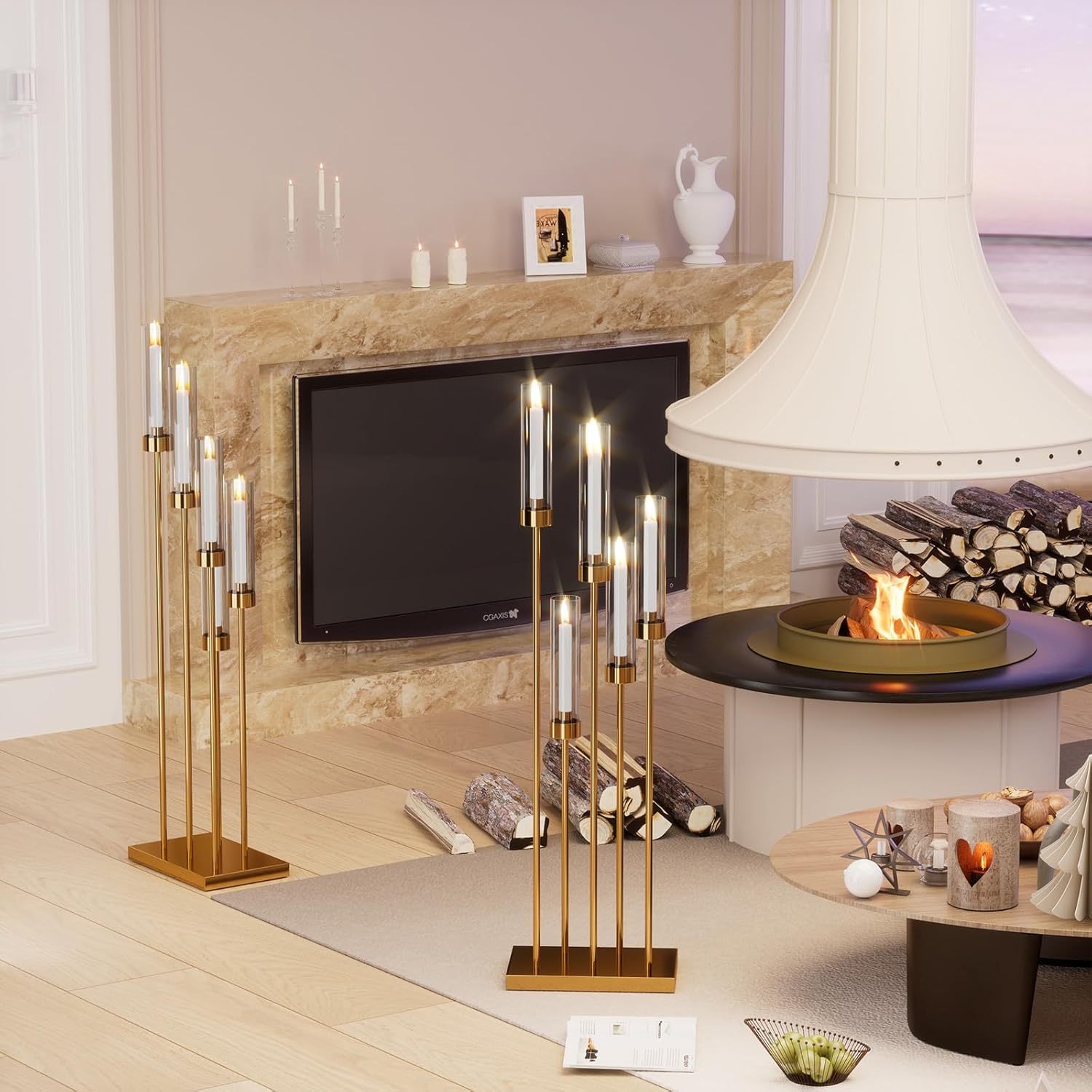 - UNIQUE DESIGN: Our 4pcs floor candle holders for wedding is 5 arms, staggered, very unique, the appearance is golden, elegant and noble. The matching transparent acrylic cover adds a bit of elegance to the whole product. Note: Our products feature a protective film on the bottom. Simply peel it off to reveal the gold finish. This film is included to prevent scratches on the product