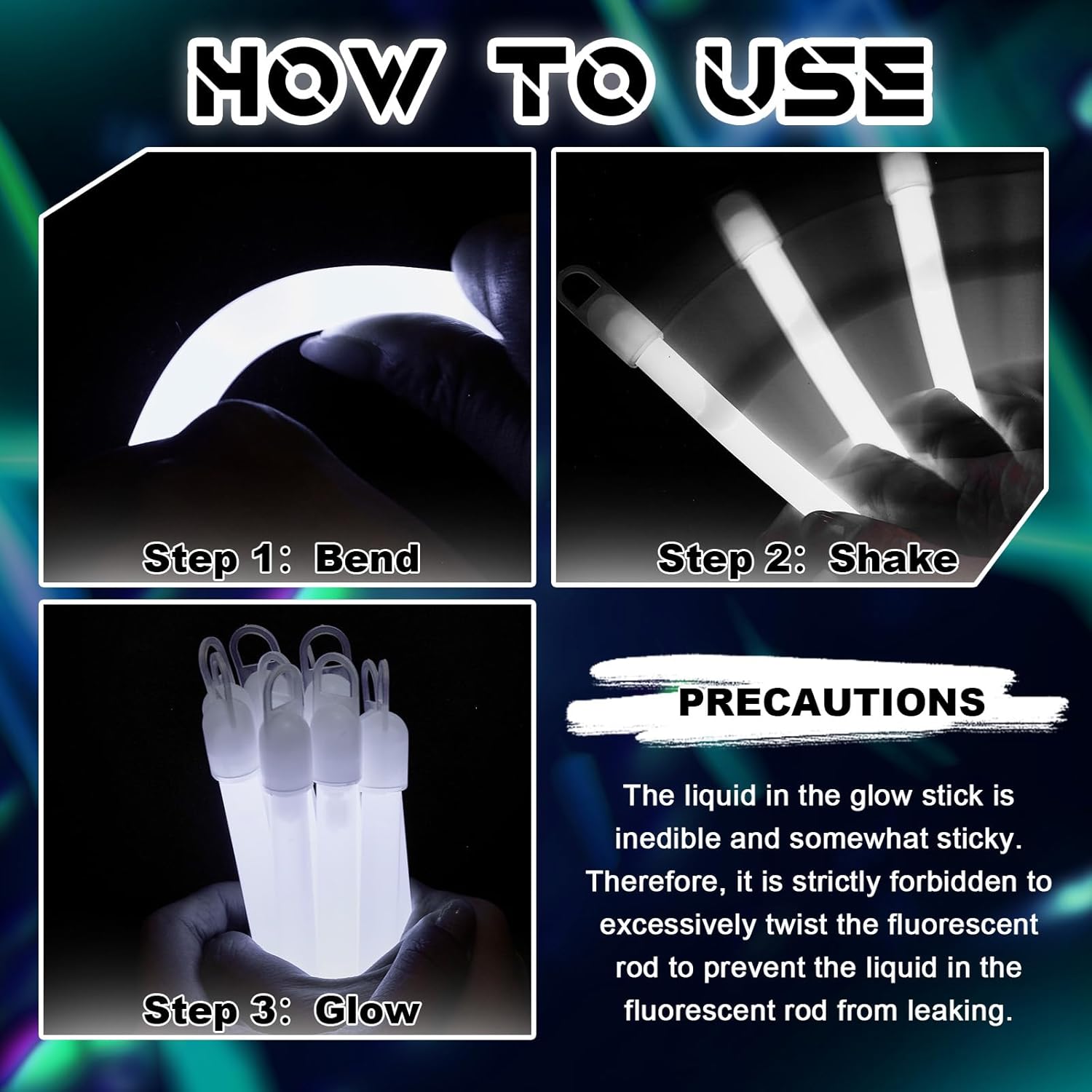 - Please Note: the liquid in the bulk glow sticks is not edible and has an adhesion; If it leaks, it is easy to pollute furniture, floors, clothing, skin, etc.; If the above situation occurs, be sure to clean it in time; If the fluid from the glow stick gets into your eyes, rinse with water or seek medical attention