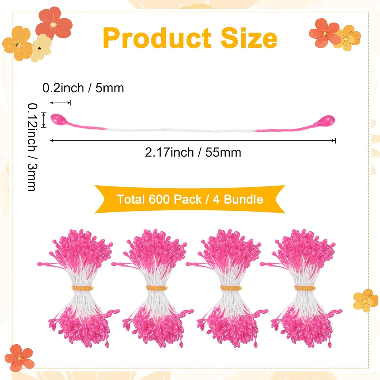 - [Size & Package] - It contains 600 mini double-headed stamens (each 55 mm/ 2.17 inch long and the fake flower head is 5 x 3 mm / 0.2 x 0.12 inch (L x W)), 4 Bundle, the fine size of the flower core better presents the natural layering of the flower