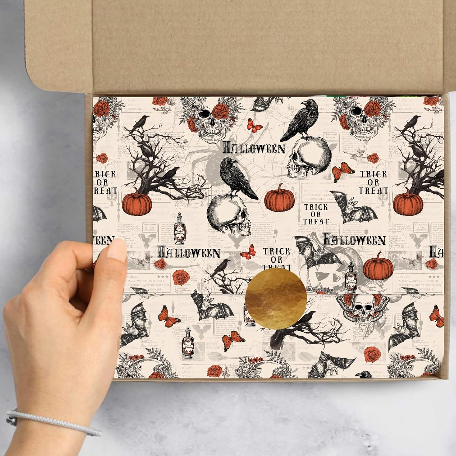 JarThenaAMCS 60 Pcs Halloween Tissue Paper Retro Gothic Skull Crow Pumpkin Wrapping Paper Decorative Art Tissue for Home Party Trick or Treat DIY Crafts, 14 x 20 Inch