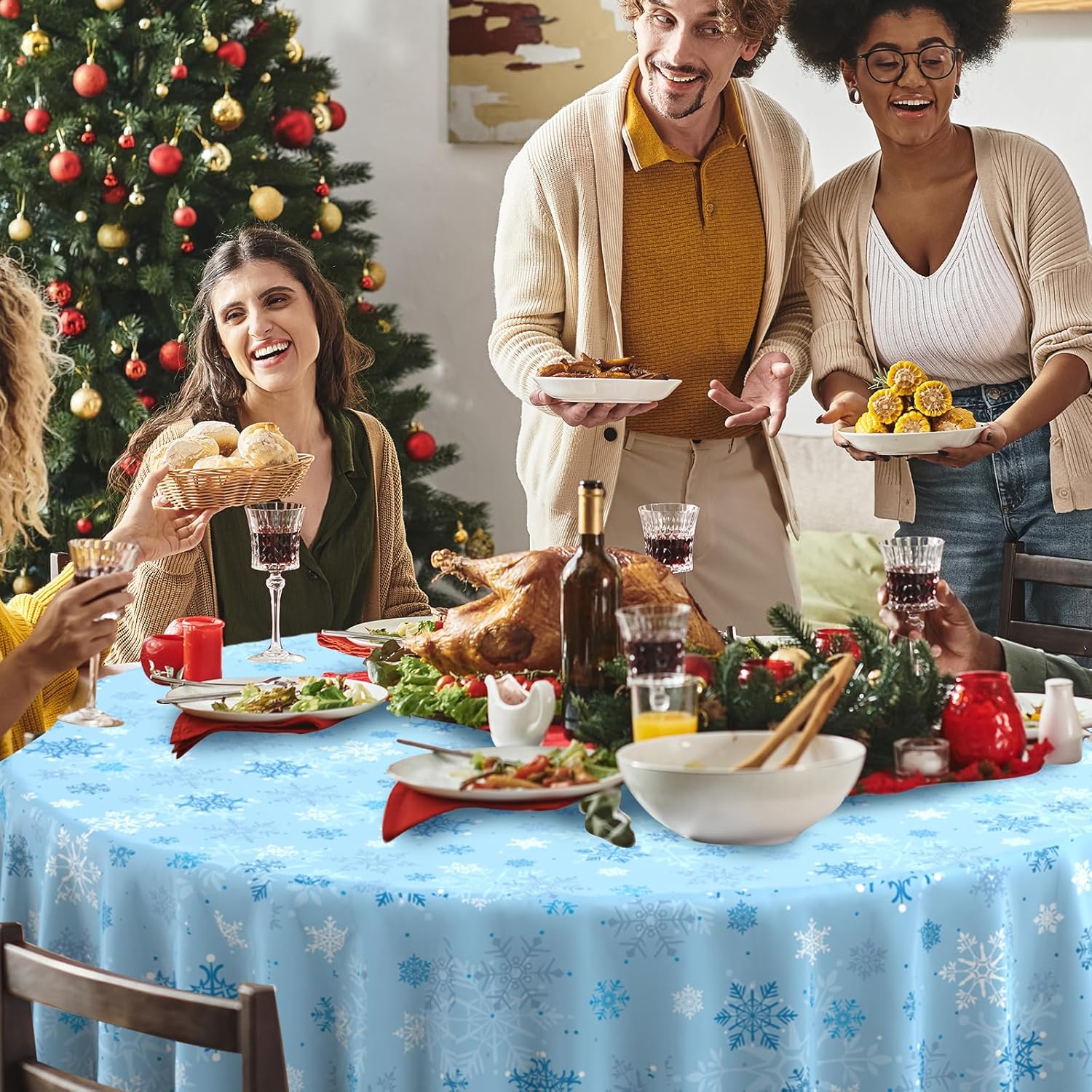 - Extra large size: these white light blue snowflake Christmas party tablecloth measures approx. 84 inch, which fits for various-sized tables that can accommodate 8-10 people, It’s large enough for your to hold a winter holiday and Christmas theme party with your family and friends to share happiness