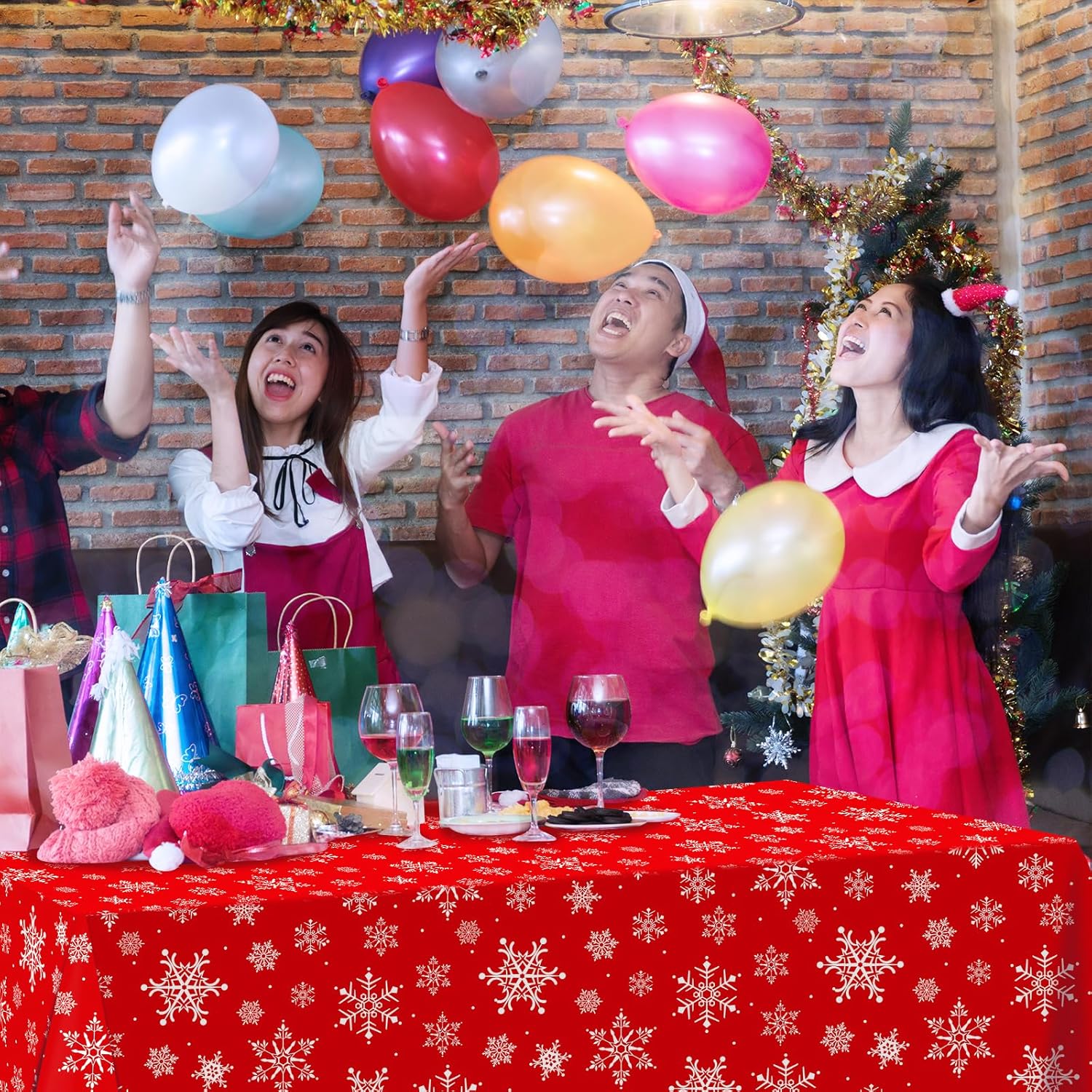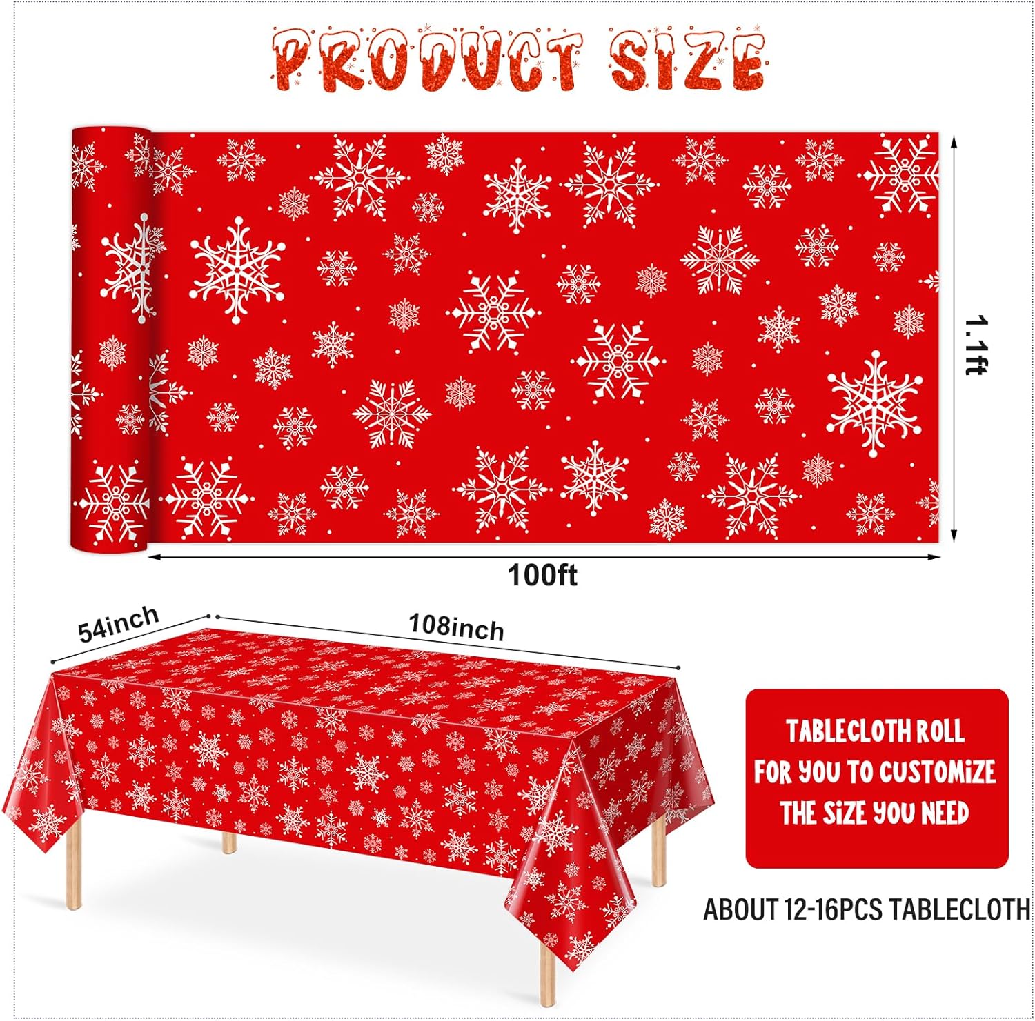 - Can be cut at will: each of red snowflake Christmas party tablecloth measures 4.5x100 feet,fits for various-sized tables that can accommodate 8-10 people,it’s printed with eye-catching colors,making it possible for you and your guest at the party impressive.You can cut it into any shapes or length as your need,to be a tablecloth for round and rectangle table,or a background for photograph