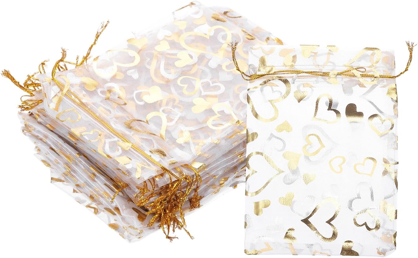 - Color: Gold Silver; Material: Polyester; Size: 16x11 cm/6.3x4.33 Inch(L*W); Packing List: 100 Pcs x Heart Printed Organza Bags (NOTE: Please confirm the size before choosing our product)