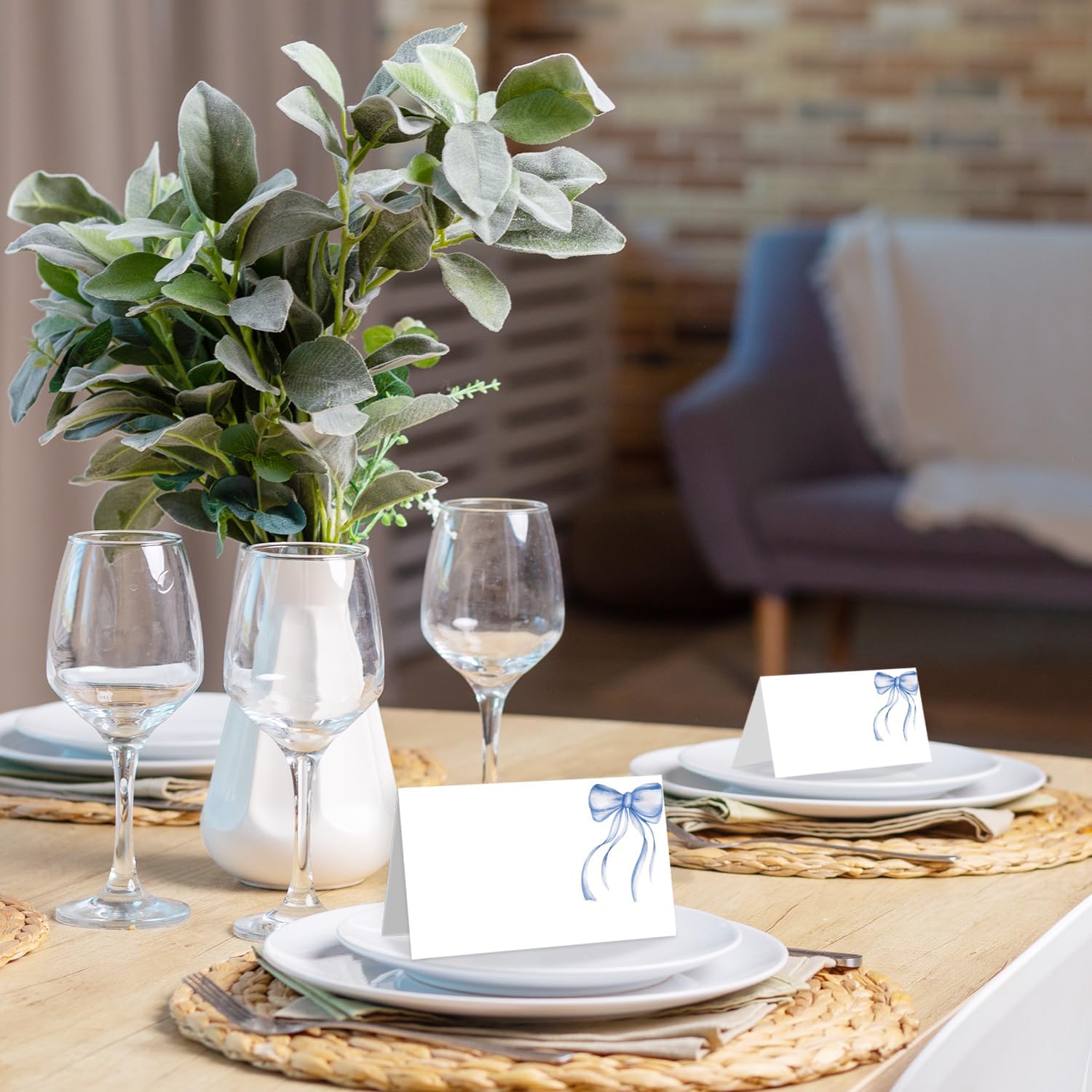 25 Pack Blue Bow Place Cards, Editable Name Cards for Table Setting, Watercolor Tent Cards Food Label for Dinner Party, Bridal Shower, Wedding, Baby Shower and Events -T32