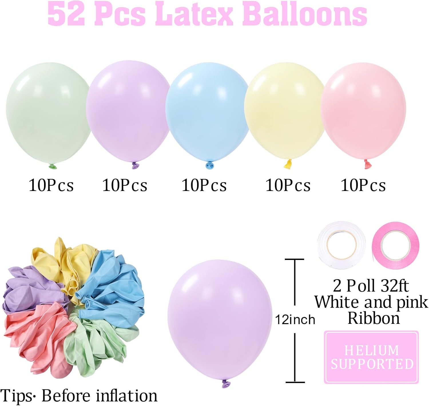 - Package Include: Our pastel balloons kit includes 10 pcs pink balloons, 10 pcs yellow balloons, 10 pcs blue balloons, 10 pcs purple balloons, 10 pcs green balloons, 1 pink ribbon and 1 white ribbon. All balloons are in soft macaron colors, making your party consistent and layered