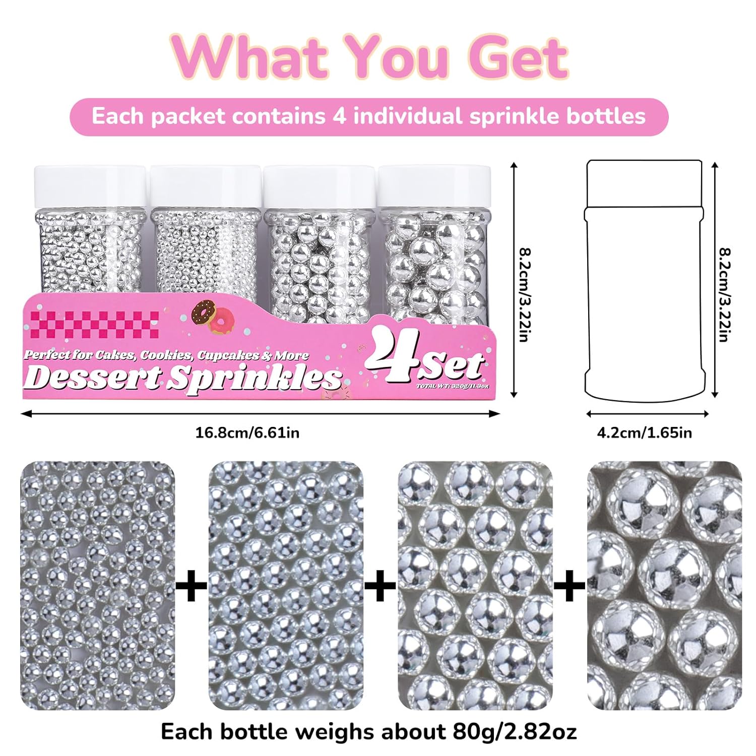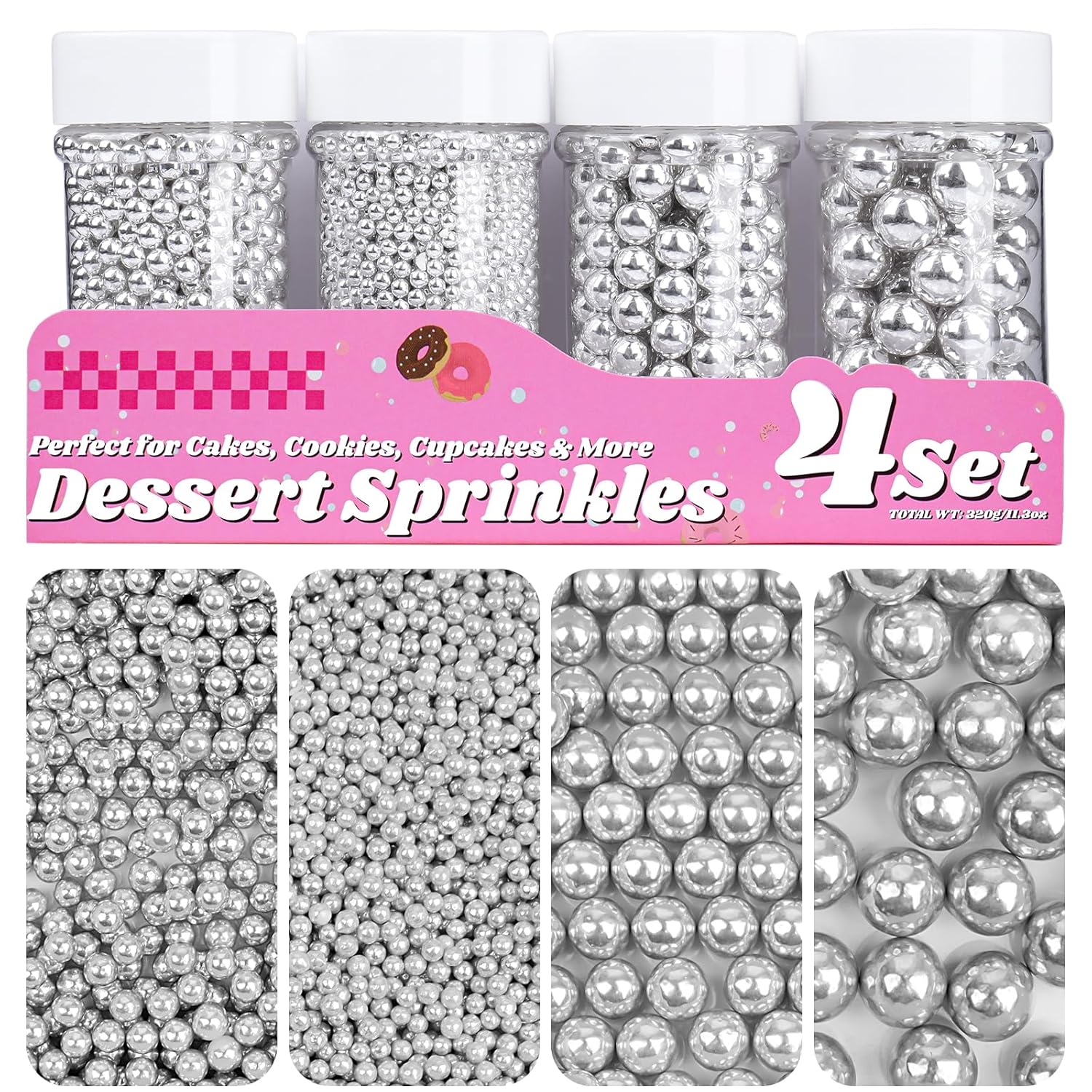 Silver Pearl Sprinkles for Cake Decorating, 11.3 Oz Edible Pearls Sugar 4 Sizes Gift Box Set for Baking Cookie Ice Cream Cupcake Toppings