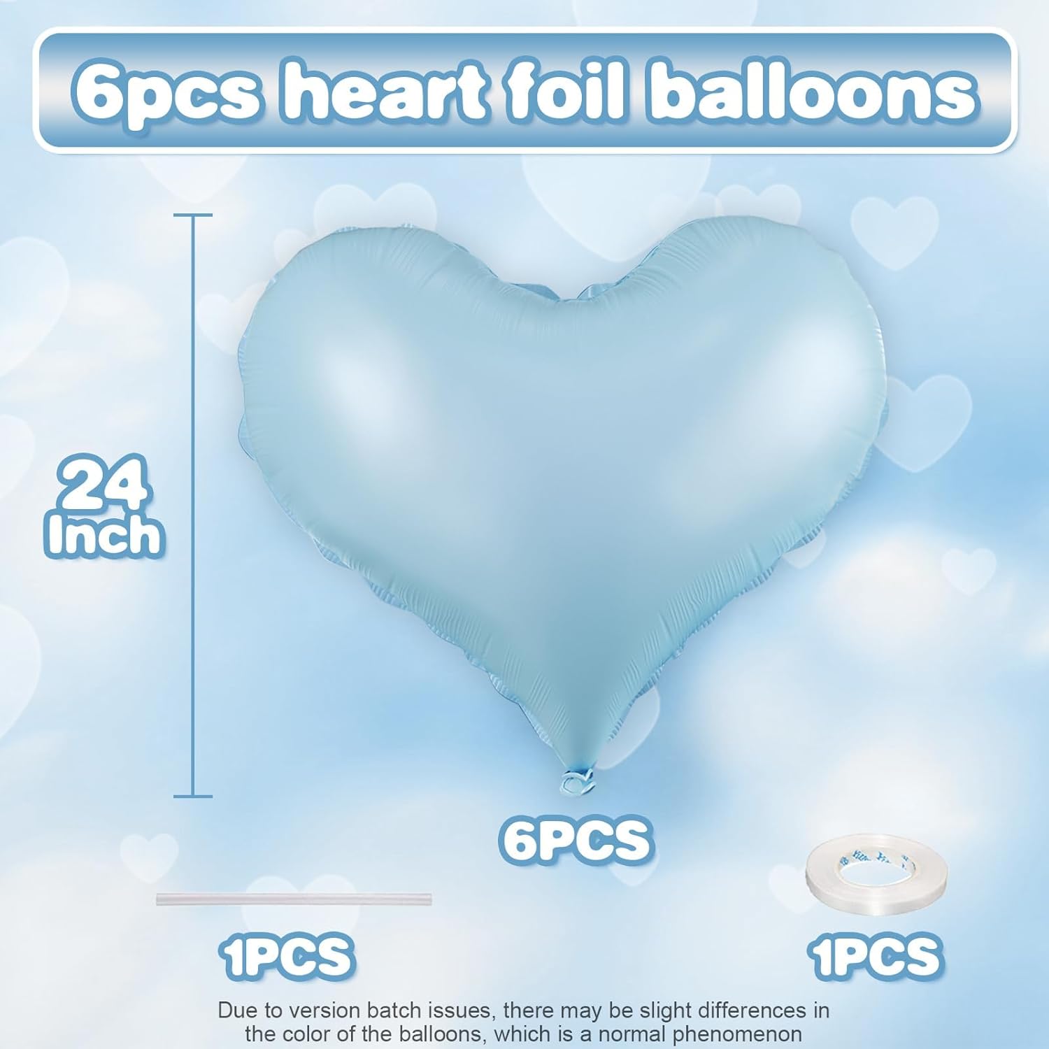 - Package: This set includes 6pcs of 24inch blue heart foil balloons,1 ribbon,and 1 straw.The generous size makes these balloons perfect for transforming any space into a festive celebration venue, whether you're decorating for a wedding arch, photo backdrop, or party centerpiece.