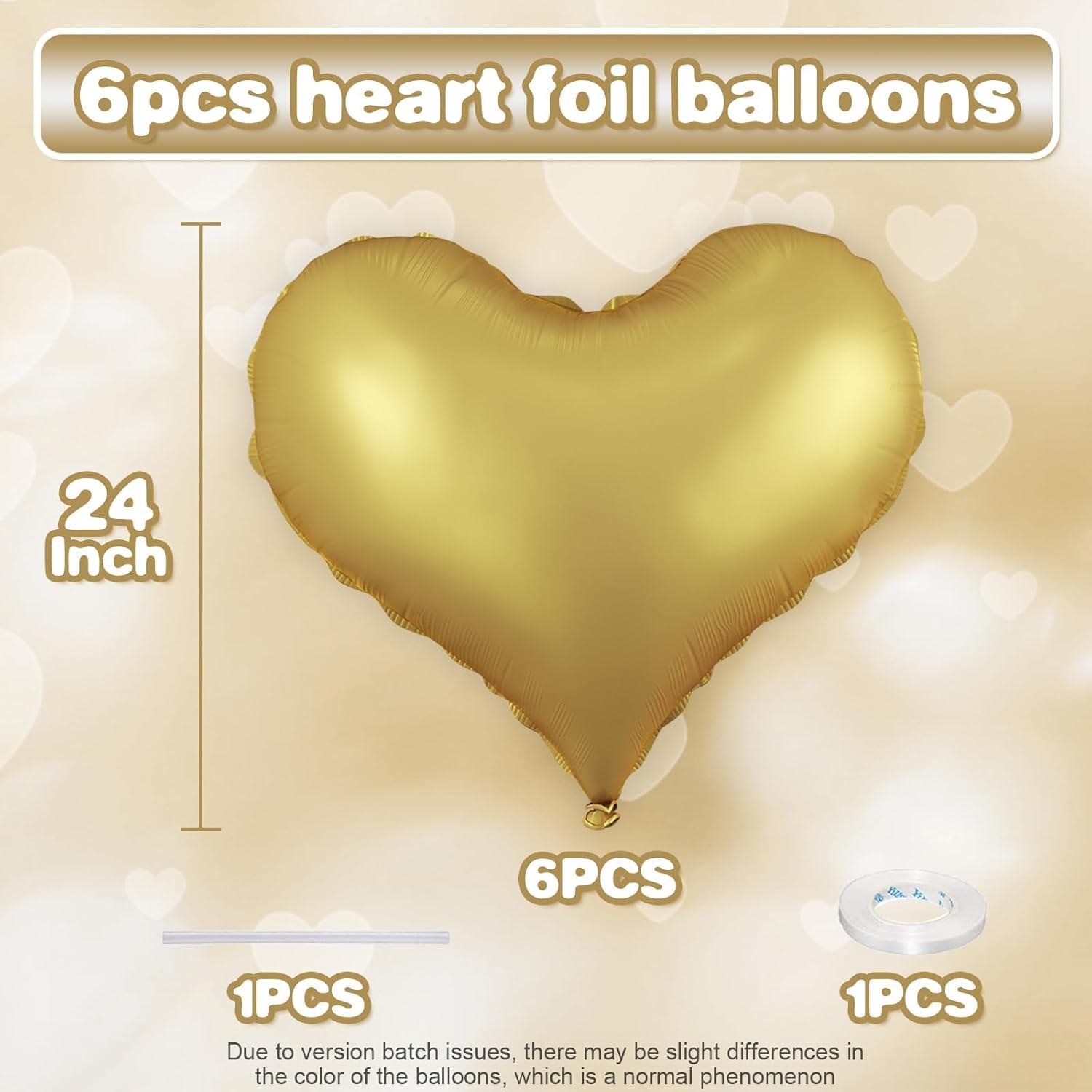 - Package: This set includes 6pcs of 24inch gold heart foil balloons,1 ribbon,and 1 straw.The generous size makes these balloons perfect for transforming any space into a festive celebration venue, whether you're decorating for a wedding arch, photo backdrop, or party centerpiece.