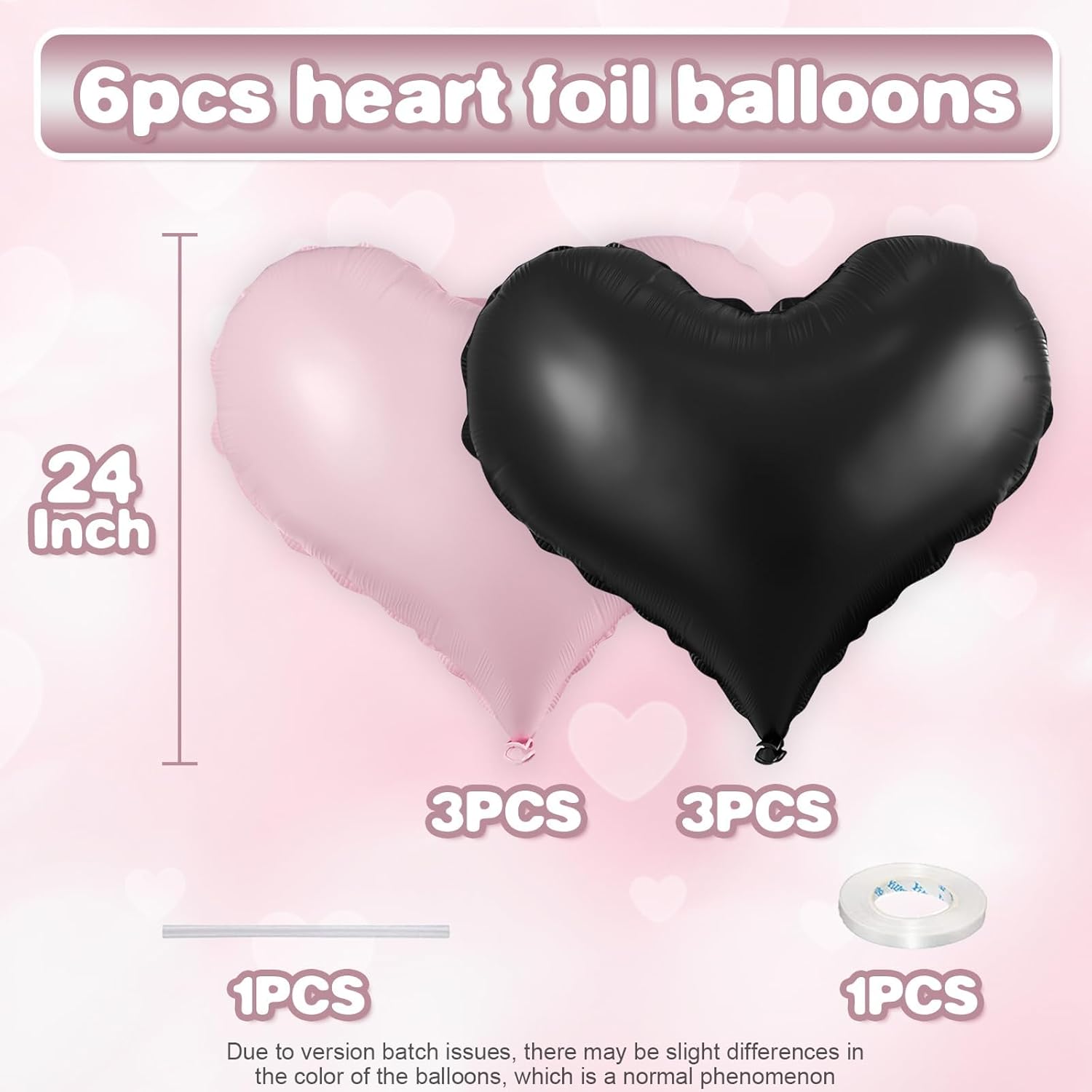 - Package: This set includes 6pcs of 24inch heart foil balloons(black*3,pink*3),1 ribbon,and 1 straw.The generous size makes these balloons perfect for transforming any space into a festive celebration venue, whether you're decorating for a wedding arch, photo backdrop, or party centerpiece.
