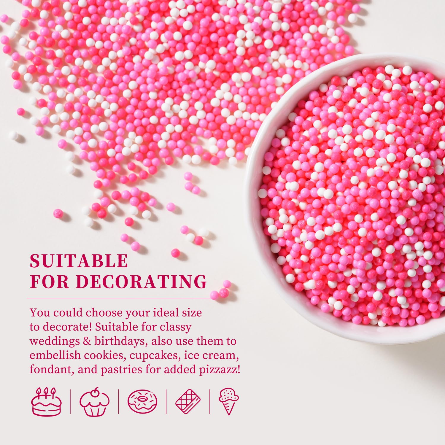 - Pink and White Nonpareils Sprinkles: A bottle of 2mm matte edible pearl sprinkles(120g/4.23oz), whether it's cakes, cupcakes, cookies, ice cream, cake pops, brownies, or any dessert you can dream of; our sprinkles are your go-to for that extra dash