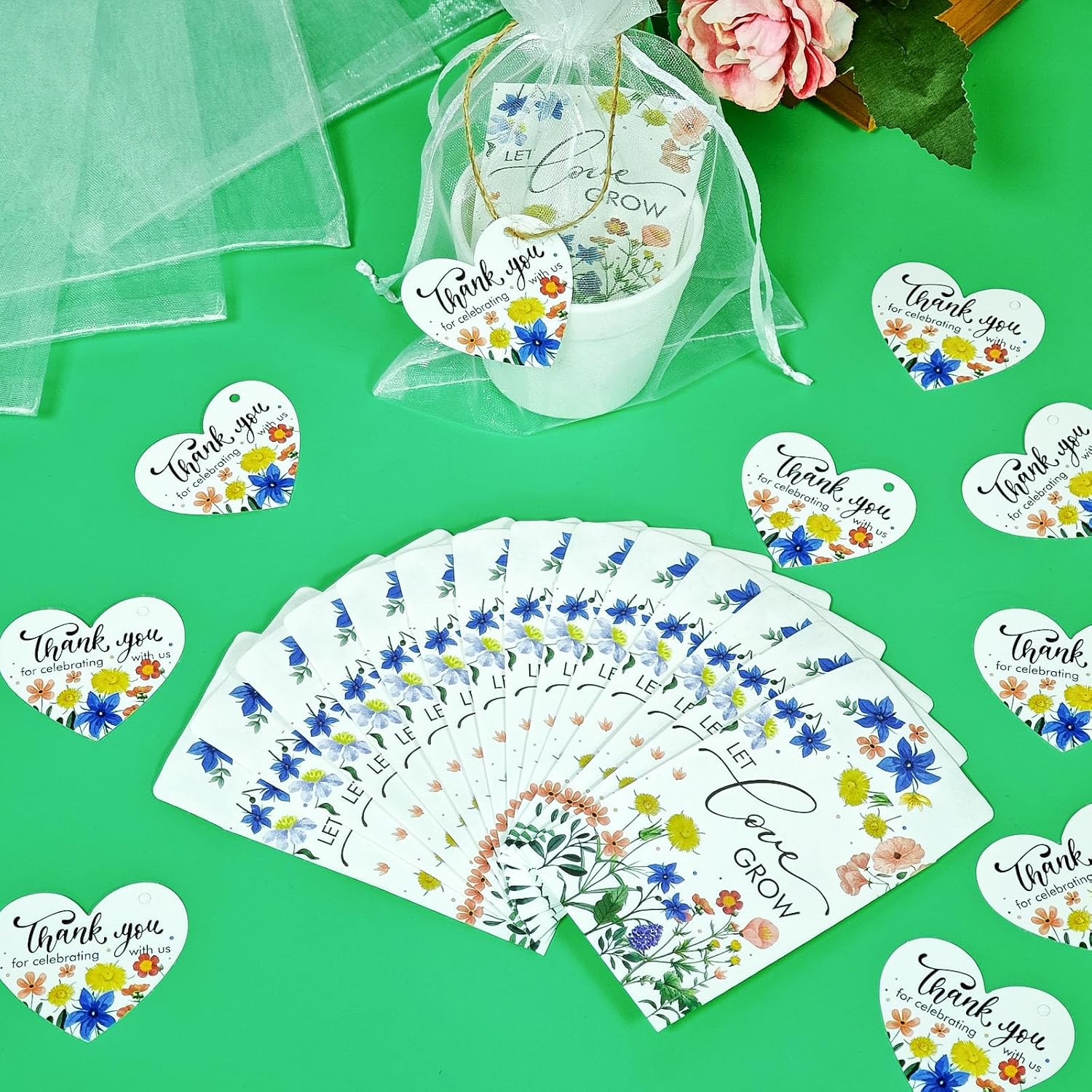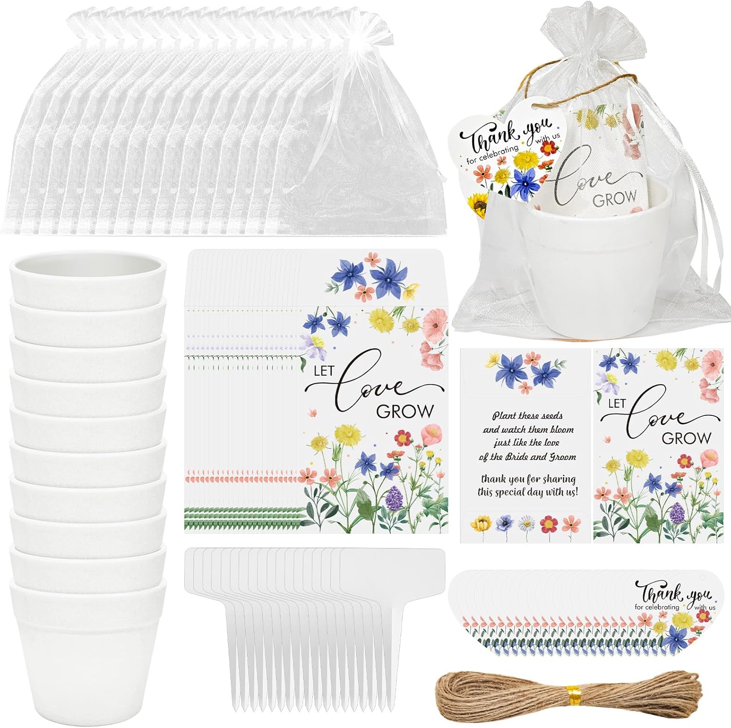 - Wedding Favor Set: This Let Love Grow wedding favor set includes everything you need: 50 plastic flower pots (2.36x2.75 inches), 50 seed envelopes (2.36x3.54 inches, seeds not included), 50 thank you tag pendants (2 inches), 50 organza gift bags (5.12 x7.09 inches), 1 roll of jute twine, and 50 plant labels. A thoughtful and meaningful gift for your guests.