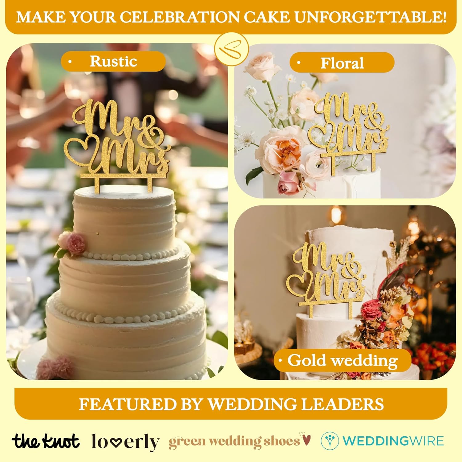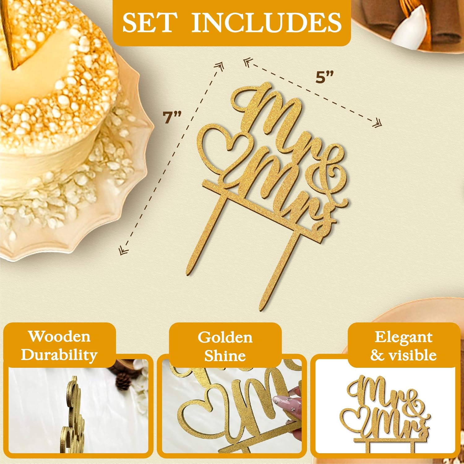 - Set include: features 1 stunning golden bride and groom cake topper, designed as a classic mr and mrs cake sign for a timeless look