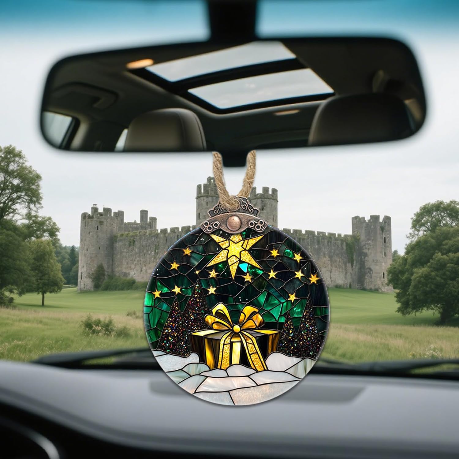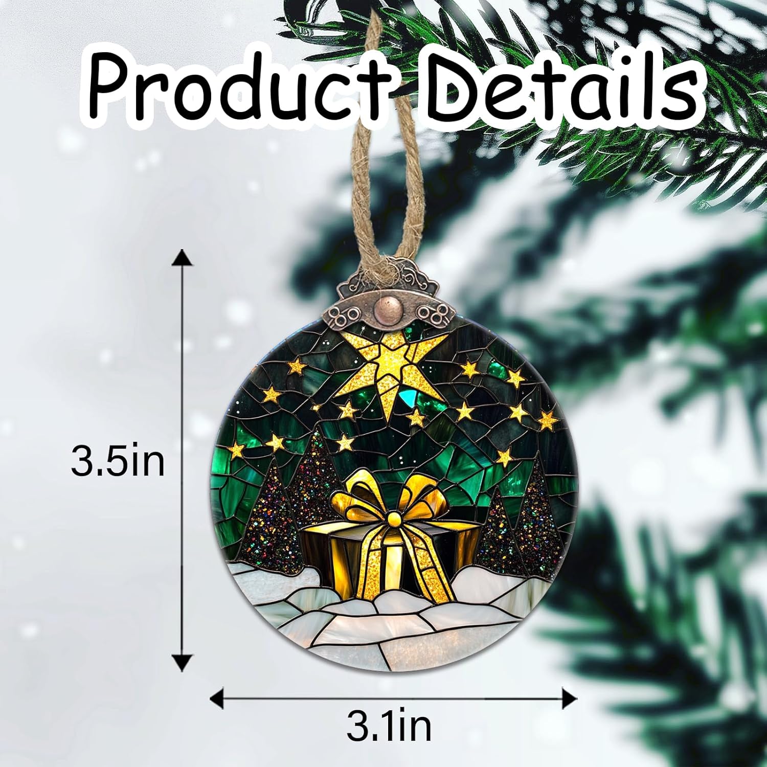 Stained Glass Christmas Decorations, Gold Star Suncatcher for Window Christmas Tree Hanging Ornaments Green Winter Night Scene Sun Catcher Xmas Decor Gifts for Women Men Mom Nana Friend