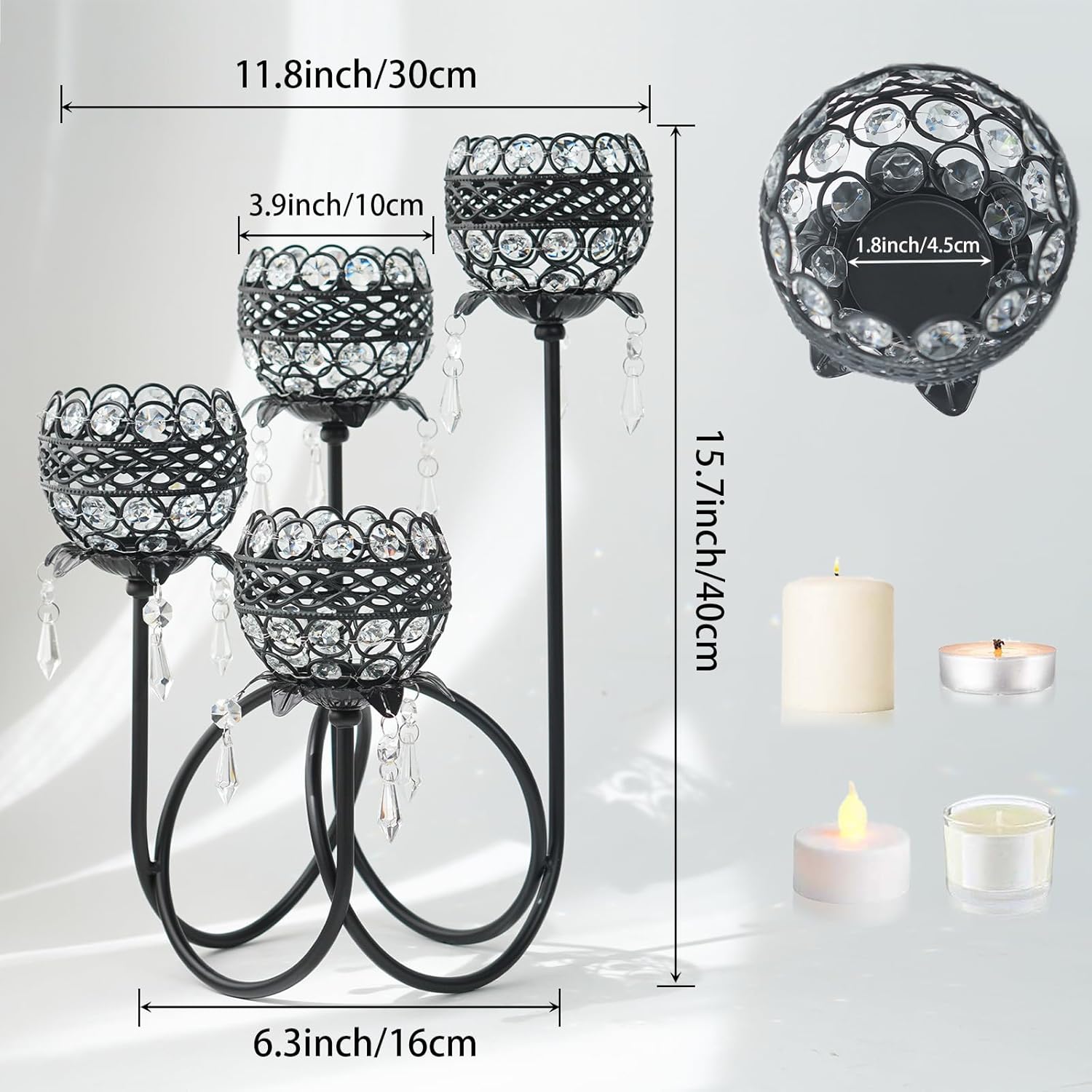 4 Arms Crystal Candelabra Tealight Holder - Tall 15.7 Inch Elegant Centerpiece with Crystal Pendant Bowls & Artistic Metal Stand for Wedding, Dining Table, Home Decor (2, Black)