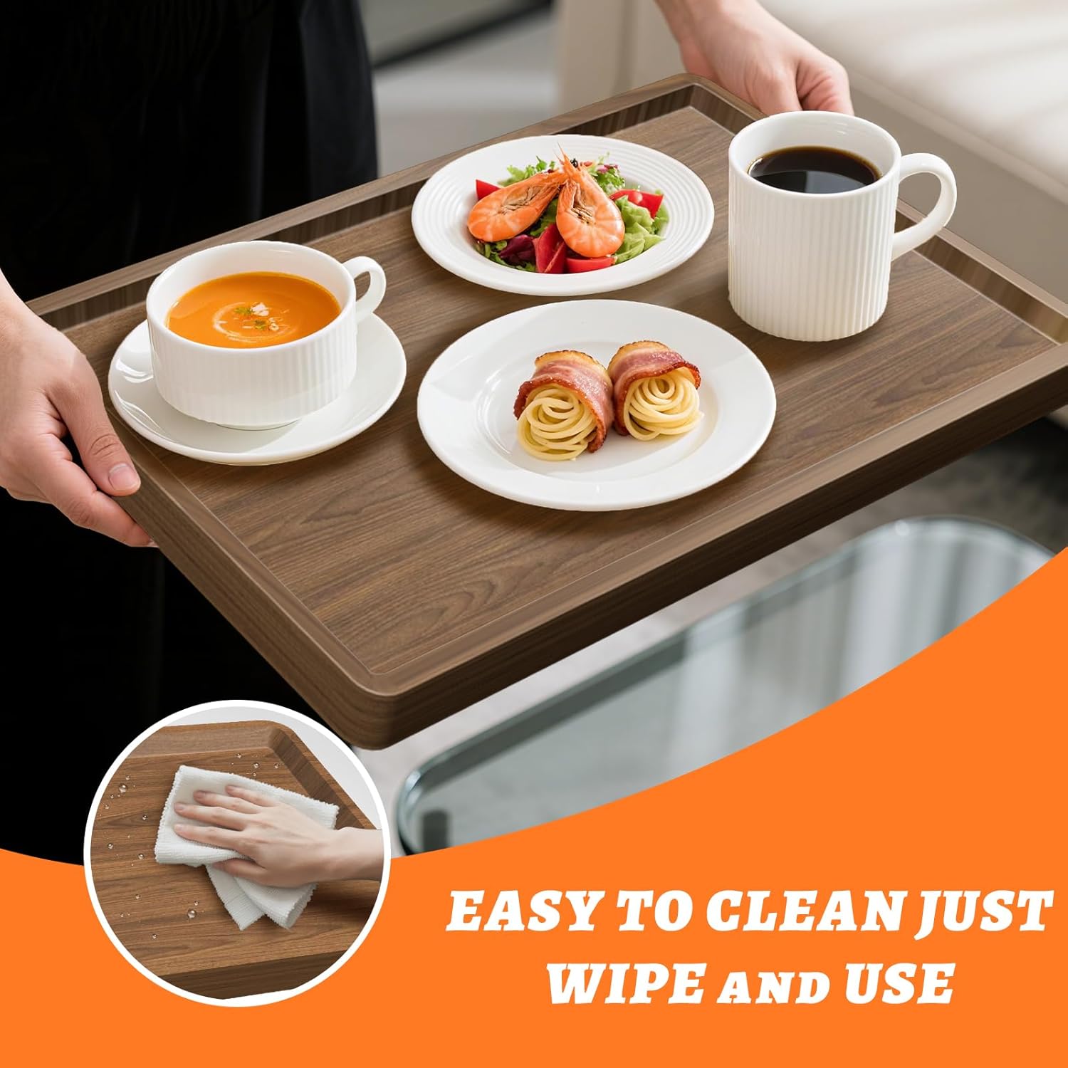 - Easy to Clean: The Serving Tray smooth, non-porous surface makes cleaning a breeze. Whether it's food crumbs, spilled water, or coffee stains, a quick wipe-down restores it to its pristine state.