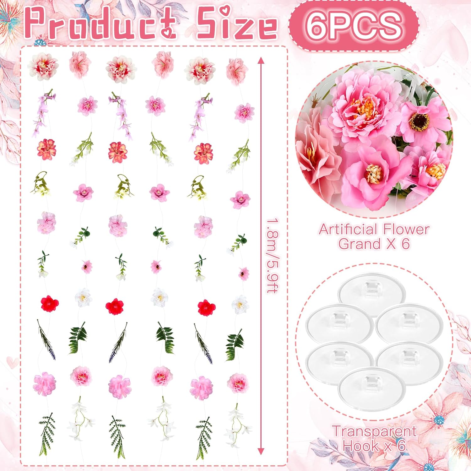 - PRODUCT CONTENT & QUANTITY:This set includes 6 hanging floral garlands, each with 10 flowers and green leaves of different sizes, suitable for making exquisite decorations. This set also includes 6 ceiling hooks for easy hanging, allowing you to easily decorate any space. This set of flower garlands serves as a backdrop that is sufficient to meet your various decoration needs, whether it is for weddings, parties, or casual home decor.