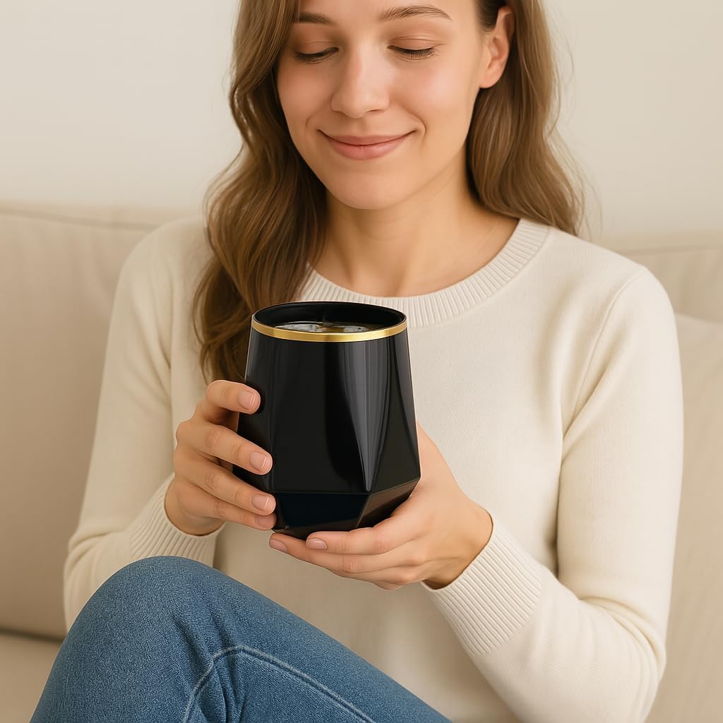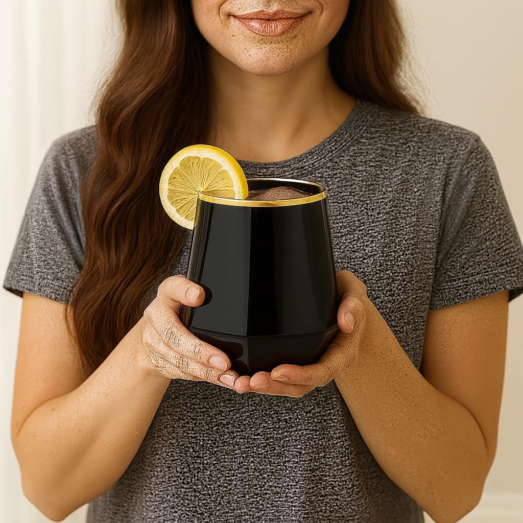 40 count Diamond Unbreakable Stemless Plastic Wine Champagne Whiskey Glasses Elegant Durable Disposable Indoor Outdoor Ideal for Home, Office, Bars, Wedding, 12 Ounce Cups (Diamond Black Matte Gold)
