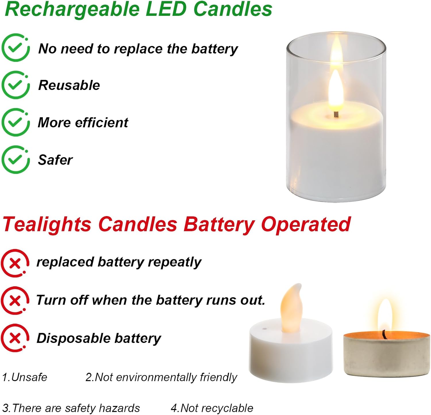- RECHARGEABLE TEA LIGHTS CANDLES: Rechargeable for repeated use. One set provides endless convenience and savings, freeing you from the hassle of constantly replacing batteries or buying new ones. Enjoy a warm, beautiful ambiance with a simpler, more eco-friendly solution