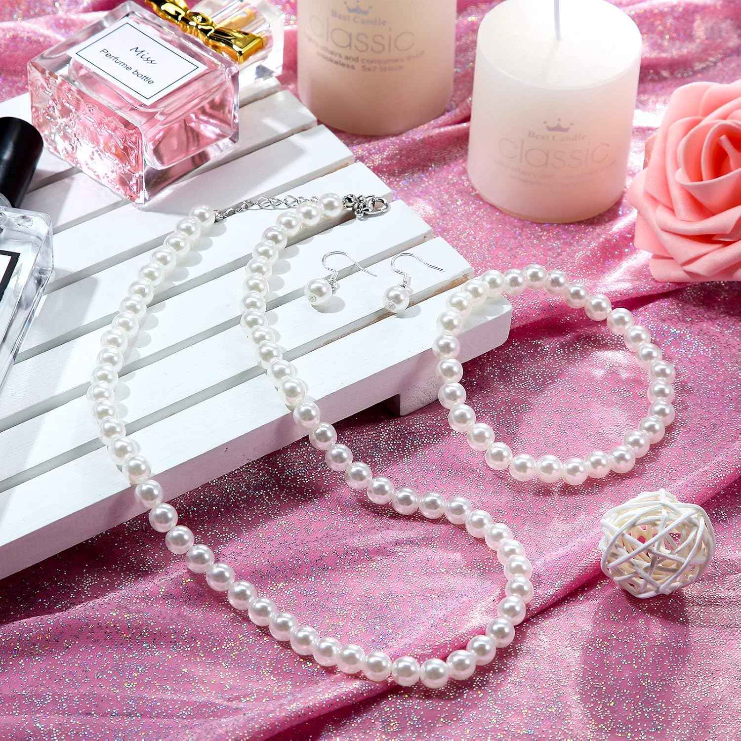 - Faux Pearl Jewelry Set: the faux pearl jewelry set includes 1 pearl necklace, 1 elastic beaded bracelet and 1 pair of pearl earrings, the necklace measures approximately 18 inches, the bracelet is 7.9 inches long, a set of matching pearl jewelry is worthy of your favor