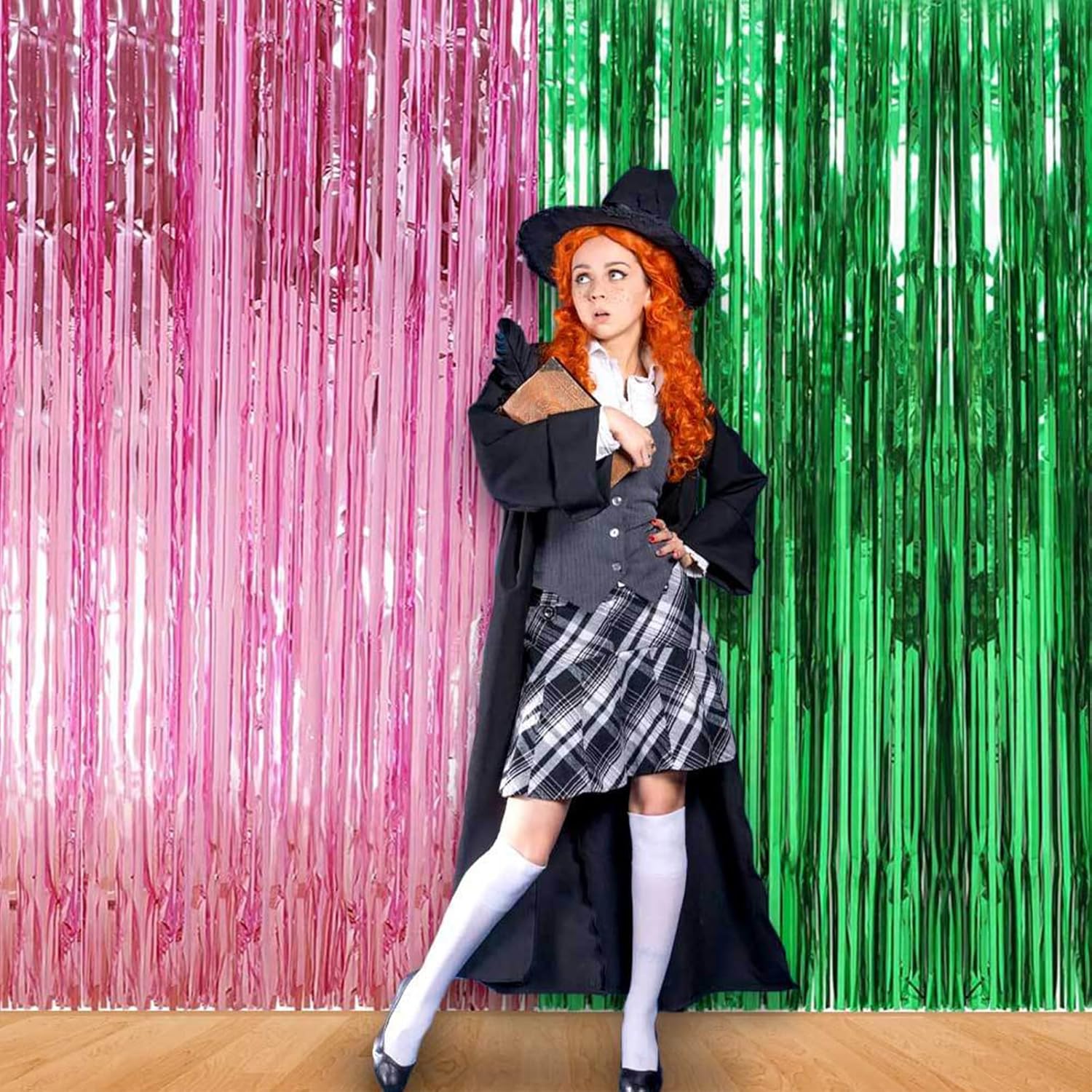 CANREVEL 2 Pack 3.3x6.6 Feet Pink and Green Foil Fringe Backdrop Curtains, Tinsel Streamers for Wicked Witch Merch Decor Birthday Party, Graduation, Halloween Party Decorations