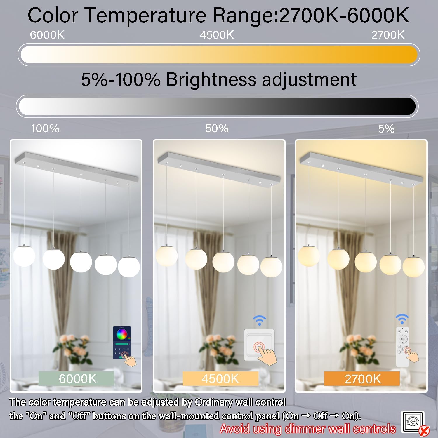 - 【Smart LED Linear Chandelier 】It is equipped with a remote control and APP control for seamless dimming between warm white (2700K) and cold white (6000K), as well as adjustable brightness ranging from 5 to 100 percent.