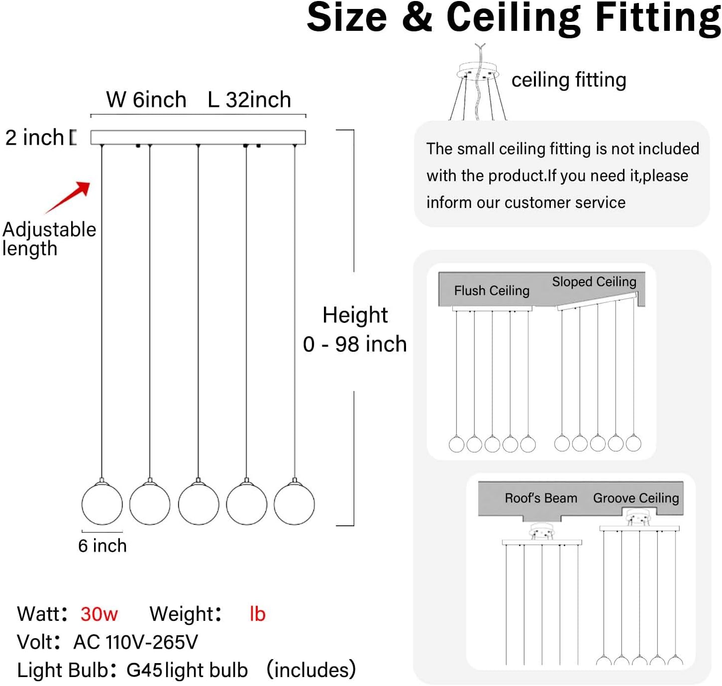 - 【Globe Chandelier Size】Modern Chandelier ceiling plate :L32"x W 6" x H 2", Chandelier max height: 98inch.Glass size:W 6inch * H 6inch,