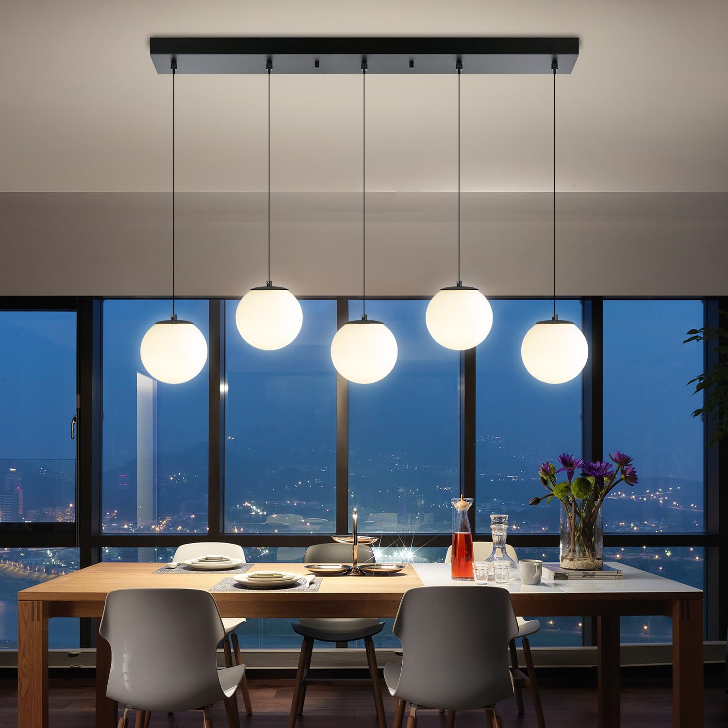 5-Lights Globe Pendant Light for Kitchen Island H 98" Black Rectangle Chandelier Milk White Glass Pendant Lighting for Living Room Bedroom Entryway